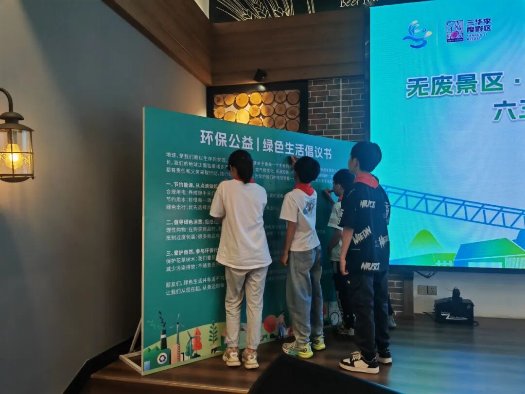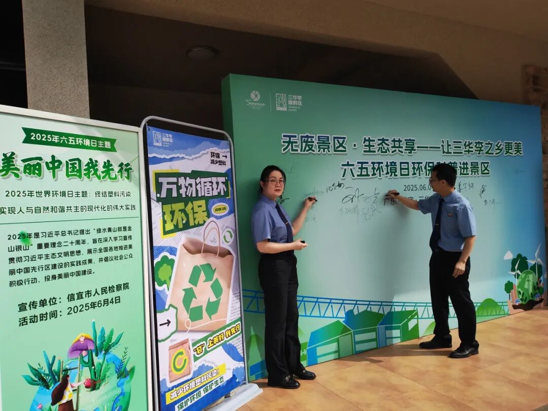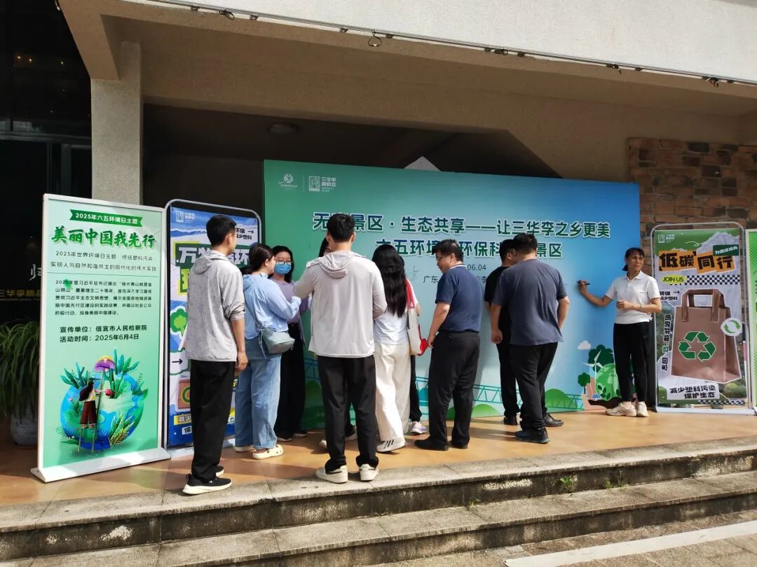 在活动现场,检察干警、市生态环境局信宜分局工作人员与师生代表共同在“无废景区・生态共享”展板签名墙上落笔。绿底黑字的签名墙前,活动参与者纷纷提笔,签下自己的名字,以自身行动承诺守护家乡生态。“这面墙上的签字,不只是对本次活动的支持,”参与群众激动说道,“更是我们对做好环境保护工作的决心!”