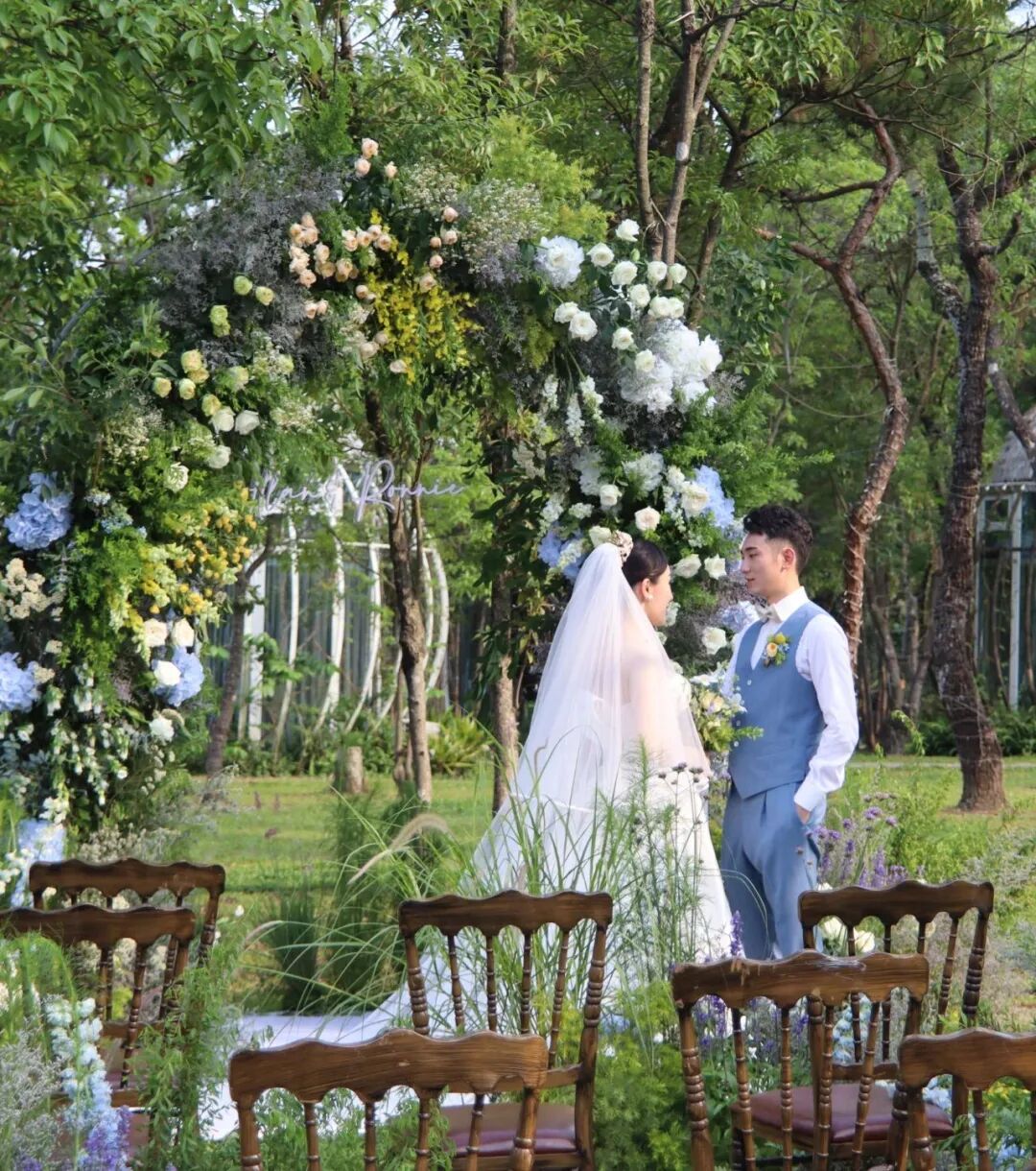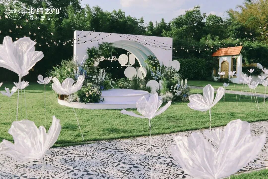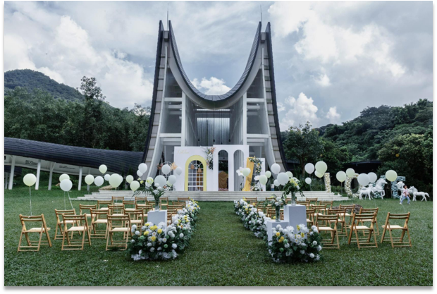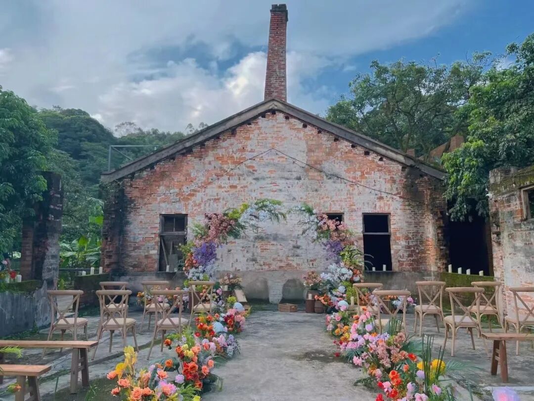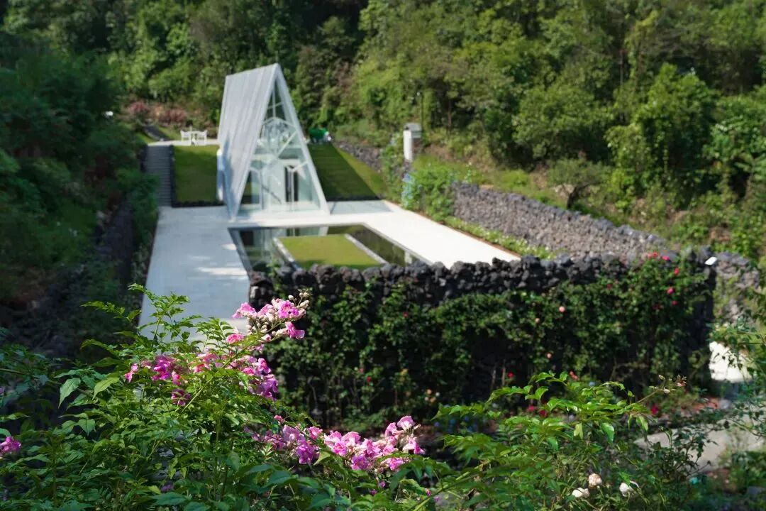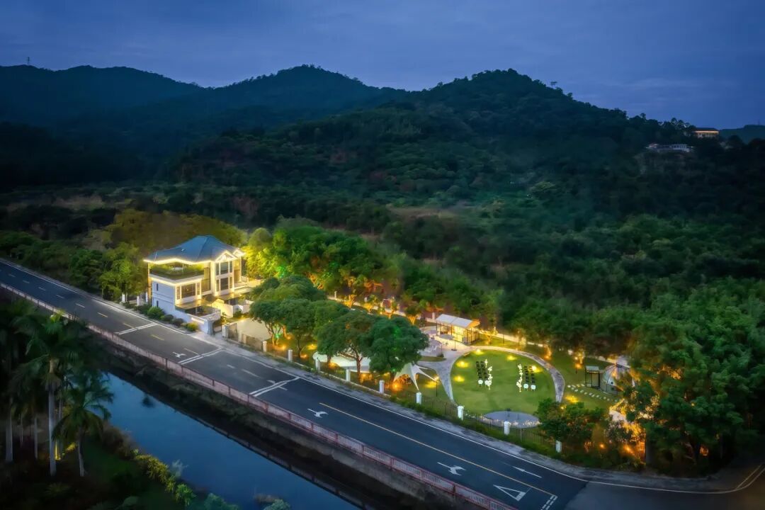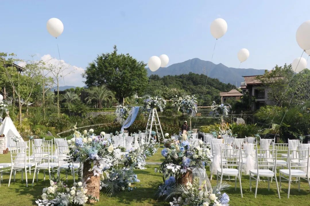 ·特色:占地面积约为5856平方米,拥有约300平方米的礼堂及无边泳池。自然与建筑的诗意交融,场地被树林环绕,门前溪流潺潺,四季风景如画--春有紫藤,夏有萤火虫与荔枝龙眼,秋可赏月摘柿,冬享温泉暖意,为婚礼提供动态的自然布景。