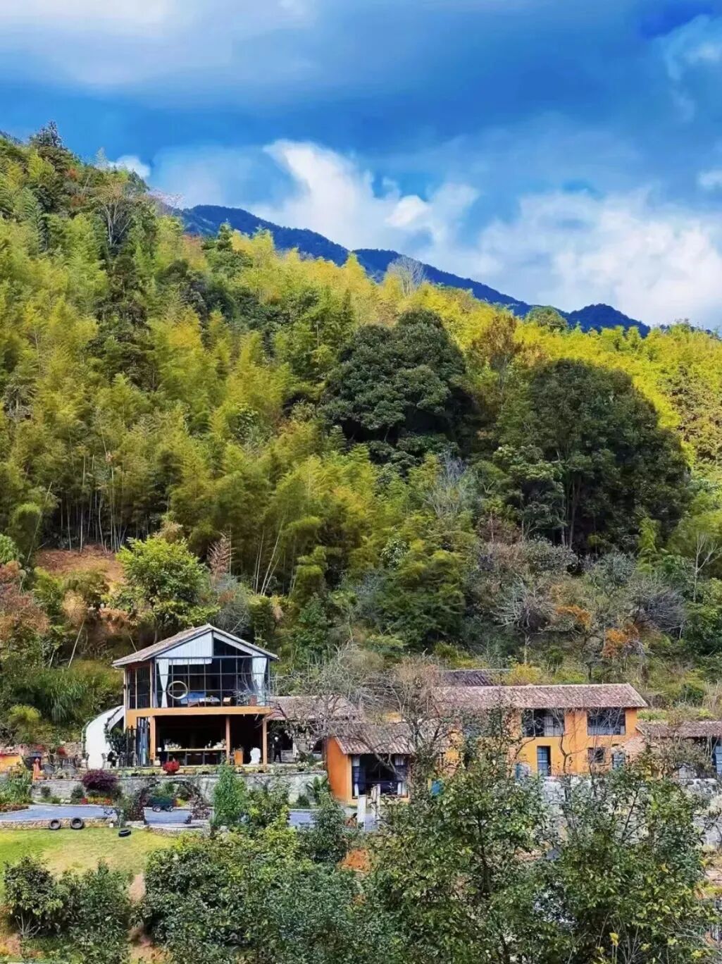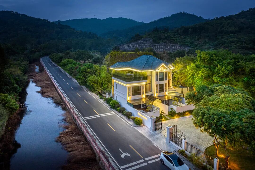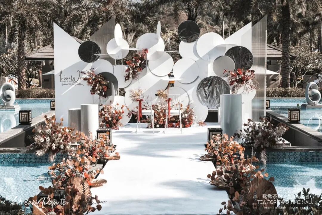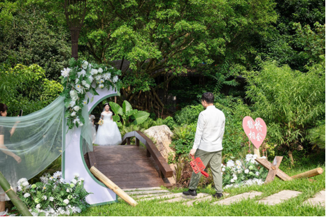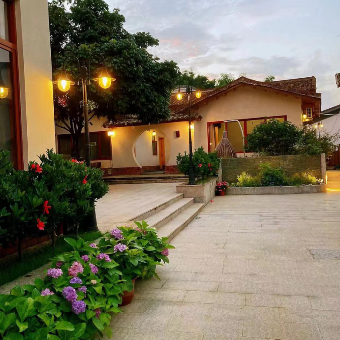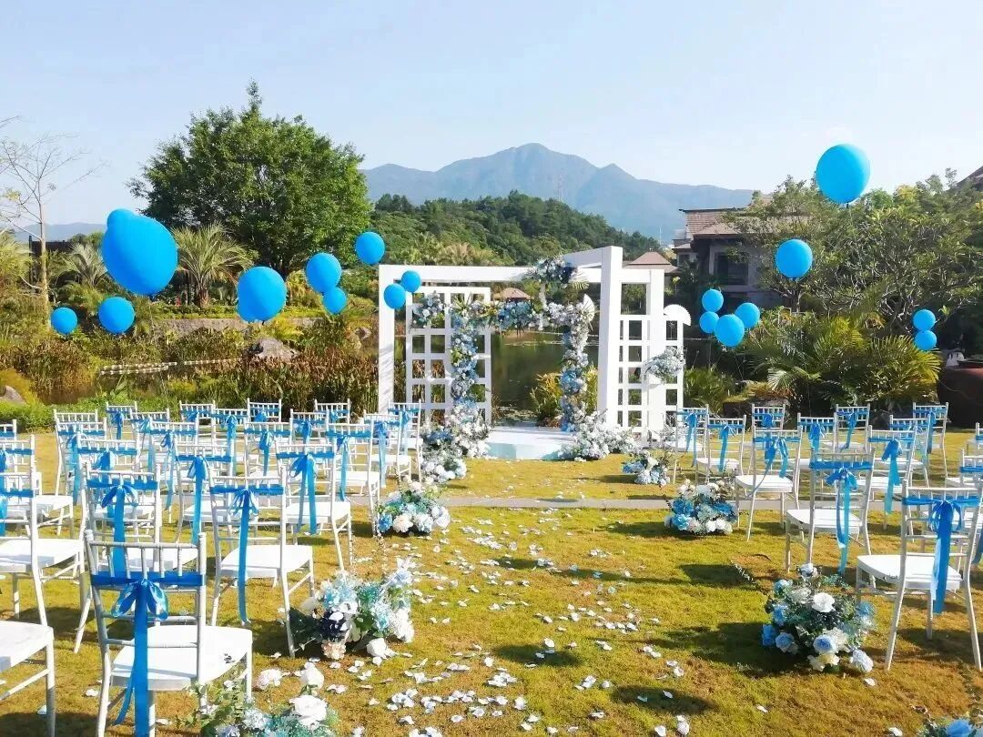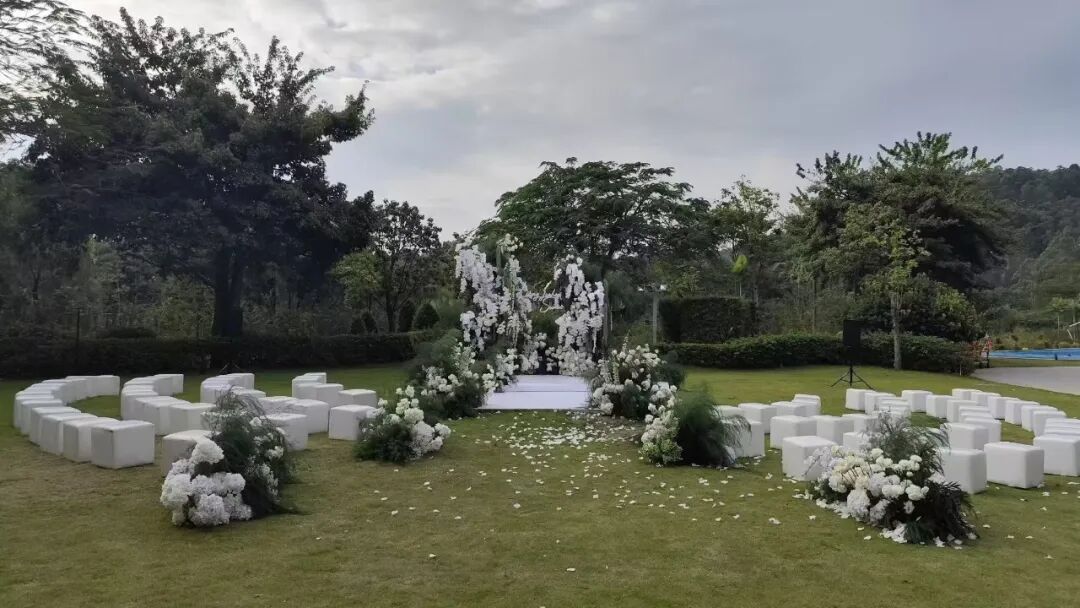 ·特色:占地面积约为5856平方米,拥有约300平方米的礼堂及无边泳池。自然与建筑的诗意交融,场地被树林环绕,门前溪流潺潺,四季风景如画--春有紫藤,夏有萤火虫与荔枝龙眼,秋可赏月摘柿,冬享温泉暖意,为婚礼提供动态的自然布景。