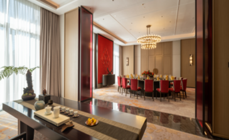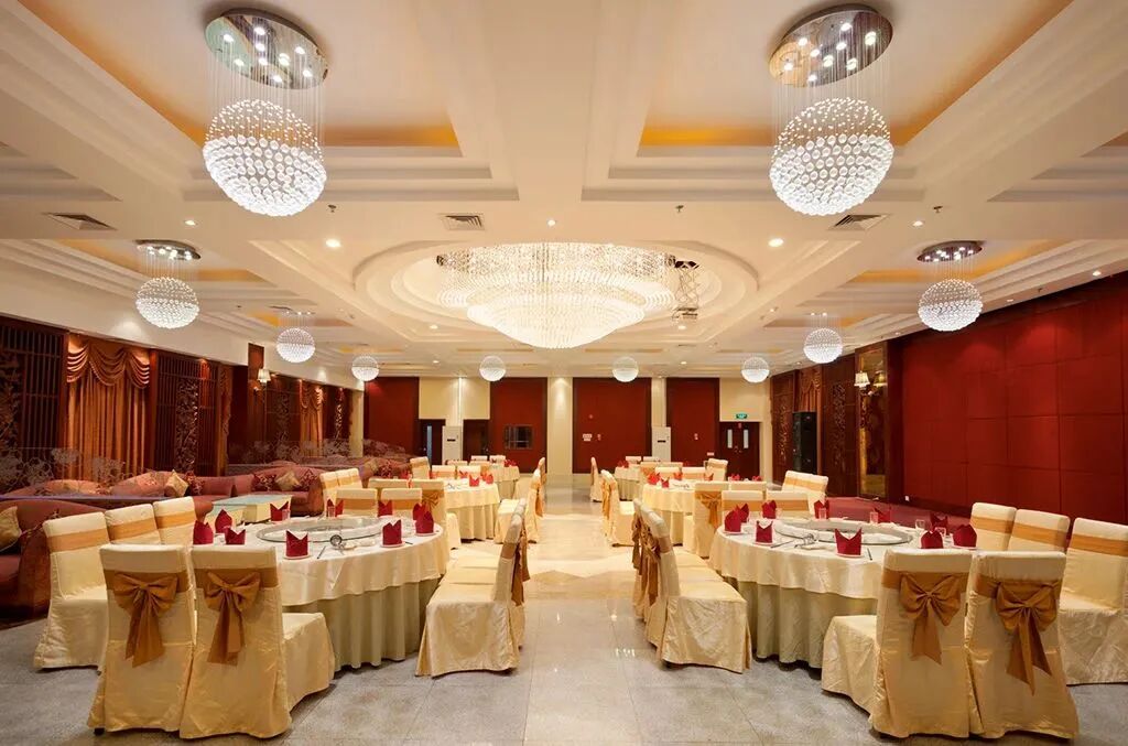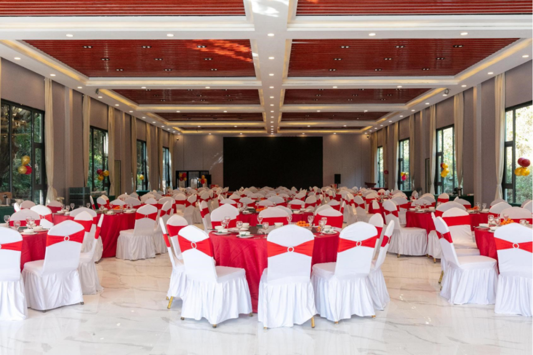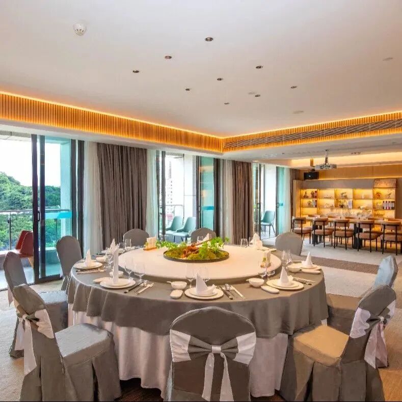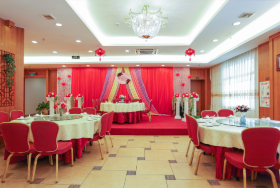 · 红棉厅:全新装修,600㎡无柱式宴会厅,可容纳300人。配备60㎡高清多功能LED屏、音响灯光设备及全方位摄像服务,风格低调奢华。