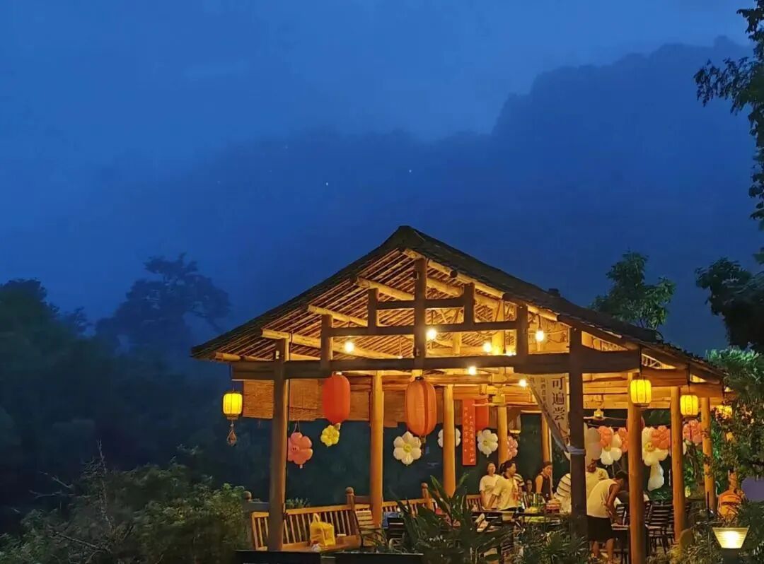 ·特色:坐拥35间客房,独享30亩幽谷,可承接100人规模的婚礼。在这里新人客亲友们能在山谷草坪,瞰云海深涧,观赏古树森林披晨雾成纱。新人们更可以黄茶园为誓,享萤火灯宴,竹林环绕婚房,佳偶天成。