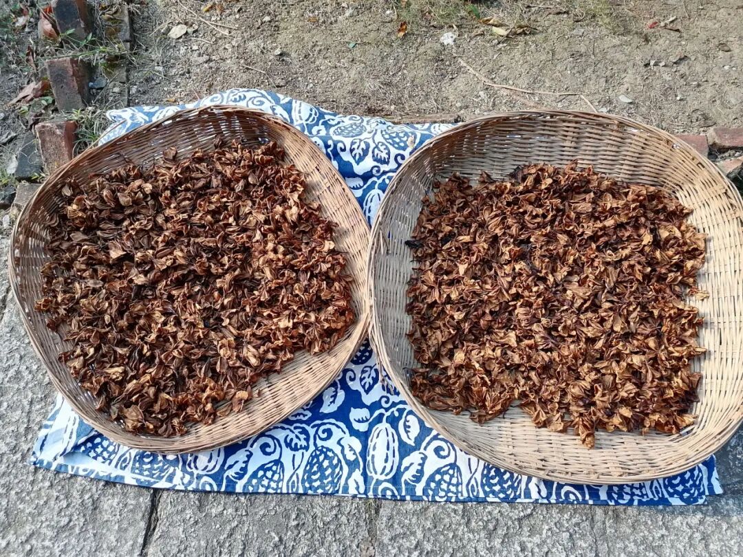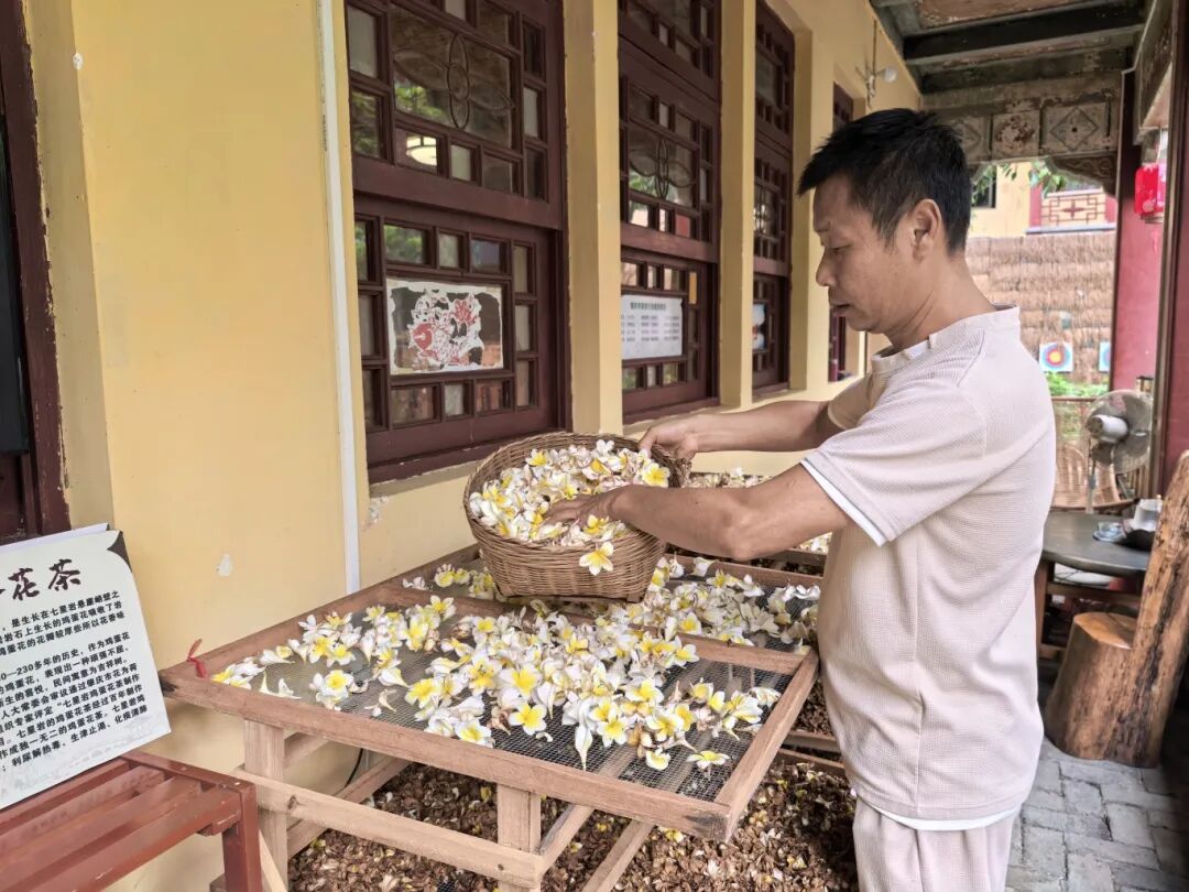 采摘这些珍贵的鸡蛋花需要独特技艺。为保护古树枝干,彭丽新采用特制的佛肚竹竹叉进行采摘。这种竹叉外宽内窄,能精准夹住成熟的喇叭形花朵,避免损伤树干。经过清洗、晾晒、阴干、拣选等多道工序,最终制成褐色的鸡蛋花茶。其中,5至6月盛开的鸡蛋花花瓣厚实、香气浓郁,制成的茶品被视为极品。