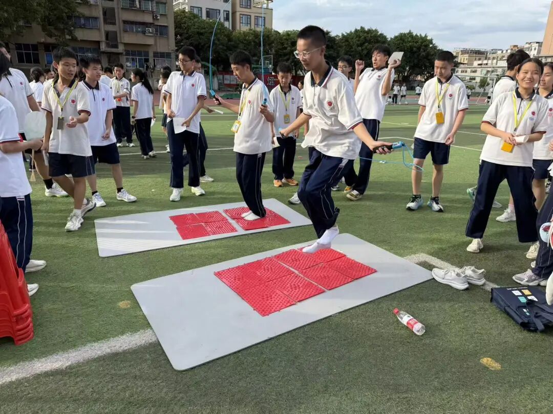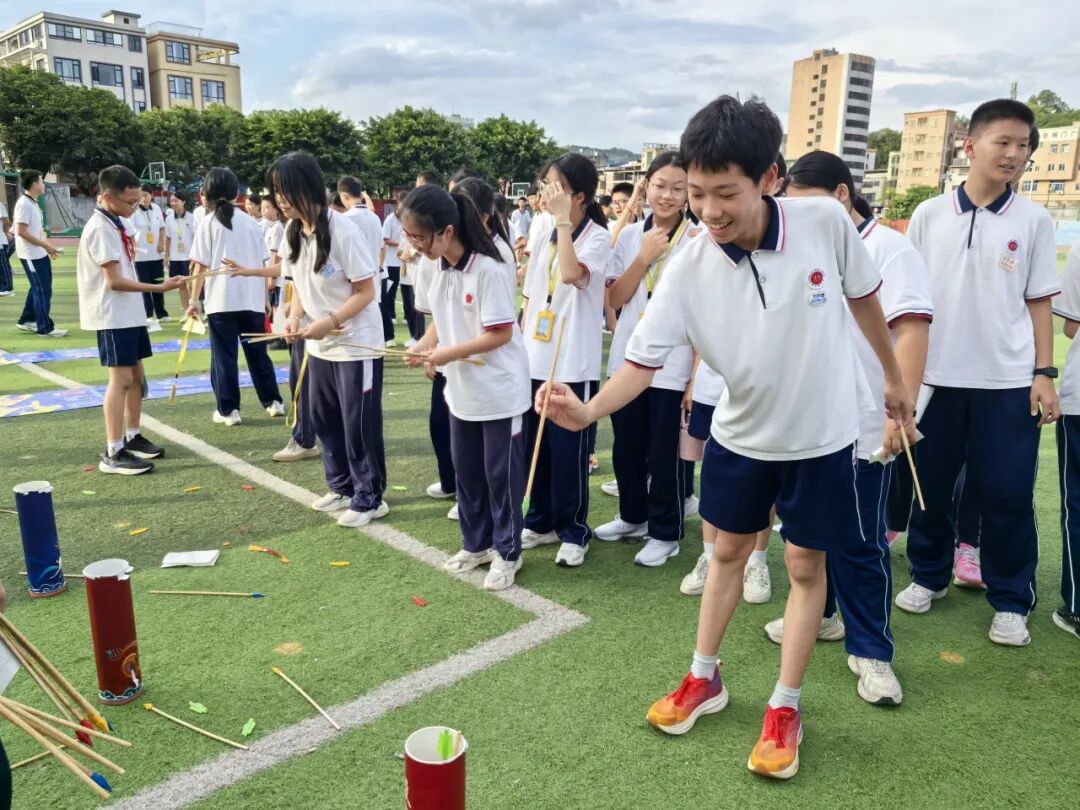 活动现场,校园田径场化身欢乐园地,学生们积极参与到游戏中。在“有一种痛只有你知道”游戏里,学生们脱下鞋子拿起跳绳踩上指压板,在每一次跳跃中释放学习上的压力。在“投壶”项目中,看似简单的投掷动作,实则需要专注与耐心,学生在瞄准和投壶的过程中,暂时抽离学业压力,在成就感中重建心理平衡。