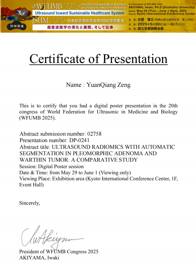 6月1日上午,省二医超声科研究生曾远强汇报了题为《Distinguishing Pleomorphic Adenoma from Warthin Tumor in parotid gland via clinically applicable deep learning from multimodal ultrasound Images》的研究。该研究聚焦于多模态超声AI模型的临床应用价值,首次创新性地将灰阶超声图像、彩色多普勒超声图像、超声特征数据及临床信息相结合用于多形性腺瘤与沃辛瘤的鉴别诊断。在学术报告的Q&A环节,曾远强与在座各国专家就研究细节进行了深入交流,充分交流了该技术的研究细节和未来方向。