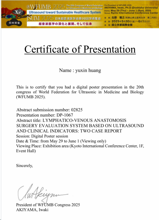 此外,《Ultrasound Radiomics With Automatic Segmentation In Pleomorphic Adenoma And Warthin Tumor: A Comparative Study》及《Multimodal Ultrasound-Based Evaluation System for Lymphovenous Anastomosis: Two Case Reports》两项研究以壁报的形式在大会中呈现,分别展示了超声影像组学自动分割技术在多形性腺瘤与腺淋巴瘤鉴别诊断中的价值及多模态超声在淋巴水肿患者淋巴静脉吻合术前后的评估作用。