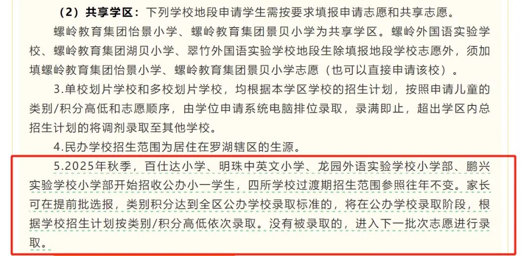 根据学位申请指南,2025年秋季,百仕达小学、明珠中英文小学、龙园外国语实验学校小学部、鹏兴实验学校小学部开始招收公办小一学生,四所学校过渡期招生范围参照往年不变。