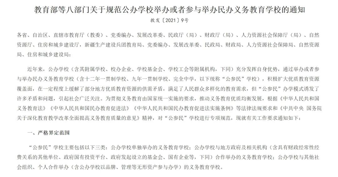 此外,为促进教育公平,2021年7月,教育部等八部门发布的《关于规范公办学校举办或者参与举办民办义务教育学校的通知》,其中提及,公办学校与其他社会组织、个人合作举办的民办义务教育学校,符合“六独立”要求(即独立法人资格、独立校园校舍及设备、独立专任教师队伍、独立财会核算、独立招生、独立毕业证发放)的,可继续举办民办学校,但应在履行财务清算等程序,并对民办学校及相关单位、企业等使用公办学校校名或校名简称进行清理后,公办学校逐步退出;经协商一致且条件成熟的,也可转为公办学校。