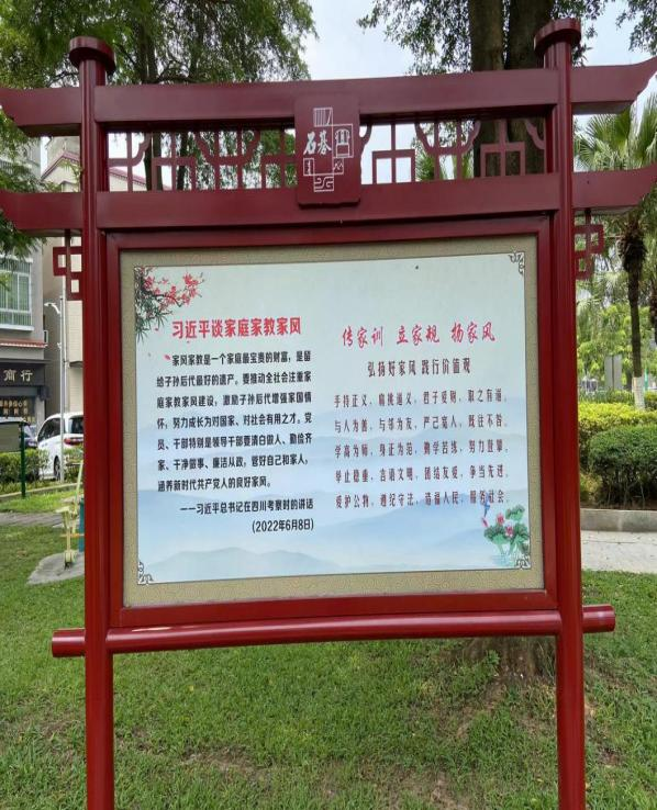 位于桥山村人大政协公园的“曾氏家风家训长廊”,融入曾氏“孝悌忠信、礼义廉耻”家族文化,依托“一廊(家风家训长廊)、一亭(新风亭)、一墙(荷花景)、一栏(家风宣传栏)”,着力打造桥山村廉洁文化基地,把廉洁文化融入到基层治理,成为石碁镇独具特色的廉洁名片。
