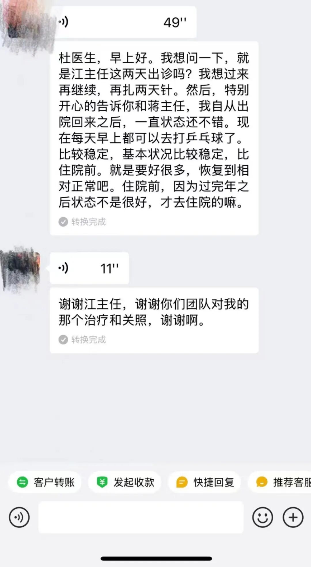 在系统接受姜迎萍主任团队的康复治疗后,任阿姨身体情况得到改善,她于最后一次患者回访中,欣喜地表示:“特别开心告诉姜迎萍主任,自从出院回来后,状态一直不错,现在每天早上都可以去打乒乓球,基本情况比较稳定,比住院前要好很多,目前已基本恢复到正常状态。”