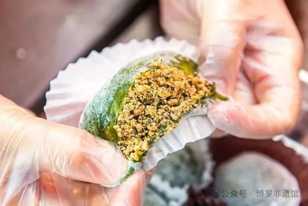 罗浮山艾粄,客家清明食俗瑰宝。艾草糯米手工舂制,分无馅(粄头)与麻糖馅(糍粑)两式。草香怡人,清甜温养,深蕴“食养同源”智慧。其多人共制传统,更凝聚亲情邻里,今成酥醪村特色产业。