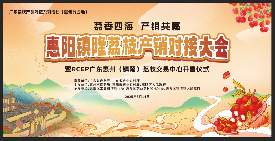 为深入贯彻落实省委、省政府关于推动农产品产销对接、助力乡村振兴的决策部署,进一步拓宽惠州荔枝销售渠道,提升品牌影响力,由广东省商务厅指导,惠州市商务局、惠阳区人民政府主办的“荔香四海 产销共赢”——2025年广东荔枝产销对接活动(惠州分会场)暨RCEP广东惠州(镇隆)荔枝交易中心开售仪式,将于6月14日(星期六)在惠阳区镇隆镇举办。