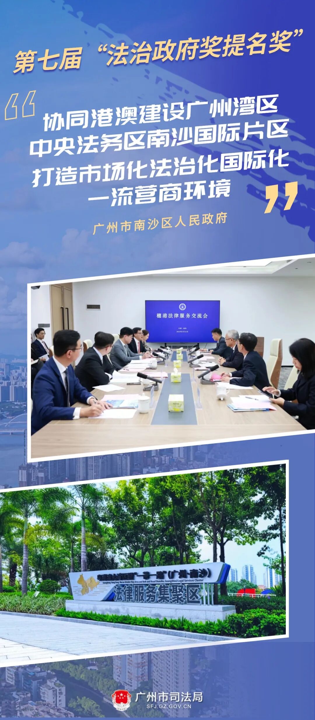 近年来,南沙以实施国务院《南沙深化面向世界的粤港澳全面合作总体方案》为牵引,协同港澳大力推进广州湾区中央法务区南沙国际片区建设,打造国际一流营商环境成效显著:获评首批全国法治政府建设示范区,连续7年法治广州建设考评优秀,中山大学发布的“中国自由贸易试验区制度创新指数”显示,南沙连续8年位列前三名。