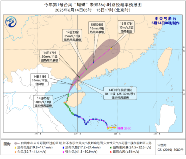 今年第1号台风“蝴蝶”已于13日23时以强热带风暴级在海南省东方市沿海登陆,登陆时中心附近最大风力11级(30米/秒),中心最低气压980百帕。预计,“蝴蝶”将以20-25公里时速向东北方向移动,强度维持或略有加强,14日中午到下午(12-15时)在雷州-北海之间登陆,登陆强度11或12级。