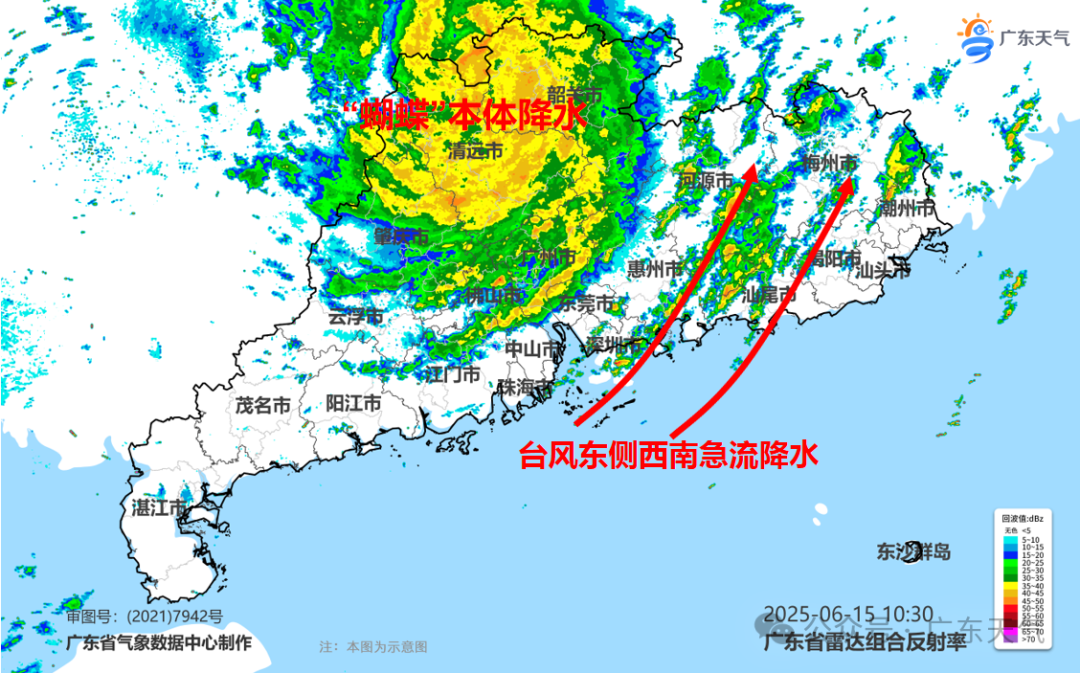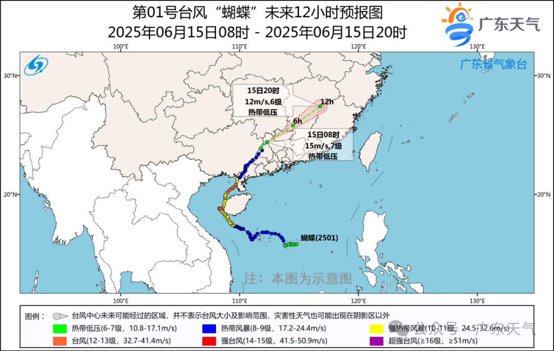 “蝴蝶”登陆后快速沿两广交界向东北方向移动,强度逐渐减弱,15日05时减弱为热带低压,08时,其中心位于清远连南境内,中心附近最大风力7级(15米/秒,热带低压)。“蝴蝶”将继续以40公里左右时速快速向东北方向移动,强度继续减弱。