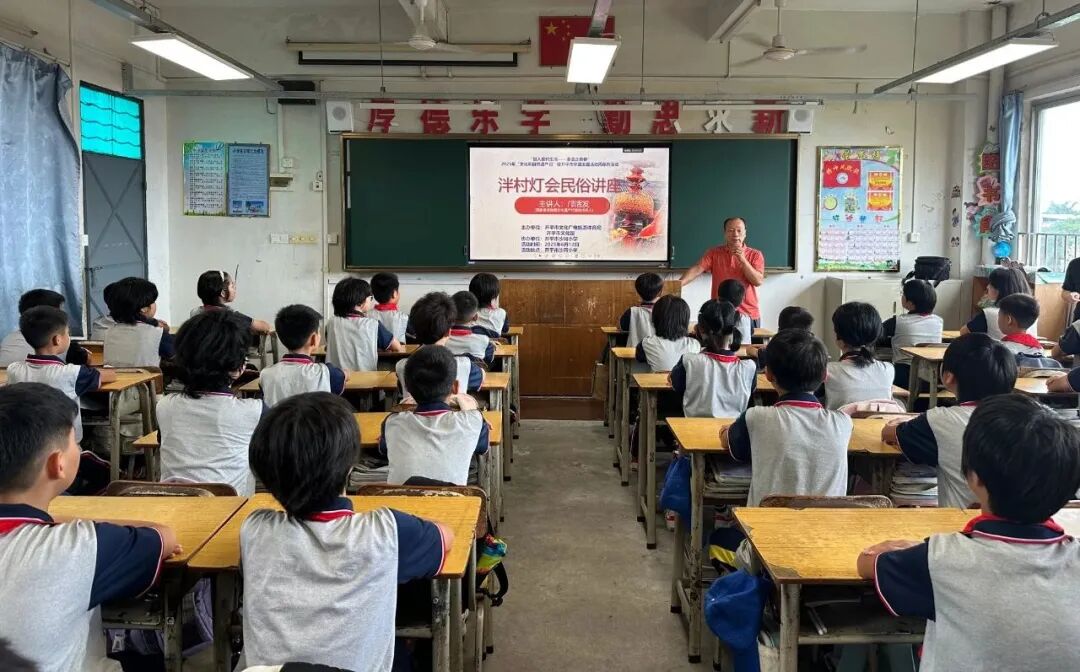 国家级非物质文化遗产——泮村灯会代表性传承人邝活发走进沙冈小学,通过播放泮村灯会纪录片和大量图文介绍的形式,向同学们详细讲述了泮村灯会历史、泮村灯会活动内容和泮村花灯制作过程等知识,有效提升了青少年对本土非遗代表性项目的认知水平,为非遗代表性项目的传承与保护奠定了坚实的青少年基础。