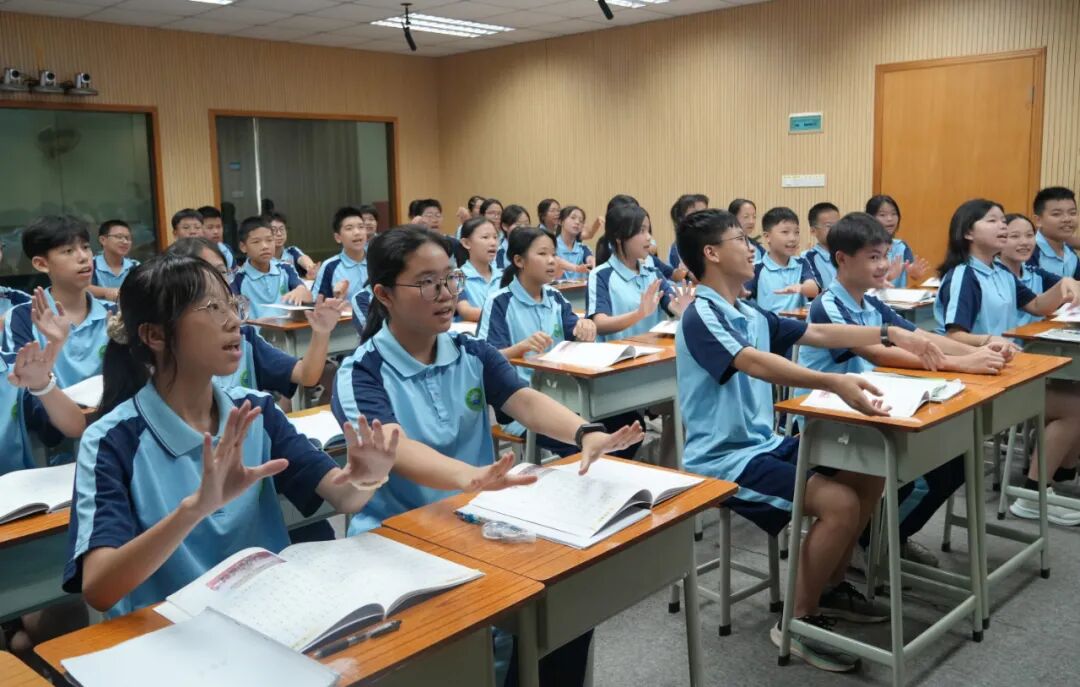 江门市级非物质文化遗产代表性项目(开平卖鸡调)代表性传承人、开平市县级非物质文化遗产项目开平民歌代表性传承人梁淑苗来到苍江中学,以一曲《咸眼匹》开场,迅速激发了同学们的学习兴趣。随后,梁淑苗带领他们学习了《欧洲西部》(小卖鸡)、《印度》(禾楼歌)等多首融入初中地理知识的原创开平民歌。在她的指导下,同学们一边配合动作,一边字正腔圆地跟唱,在方言的韵律中感受开平文化的特色,体验非遗民歌与地理学科融合的独特魅力。