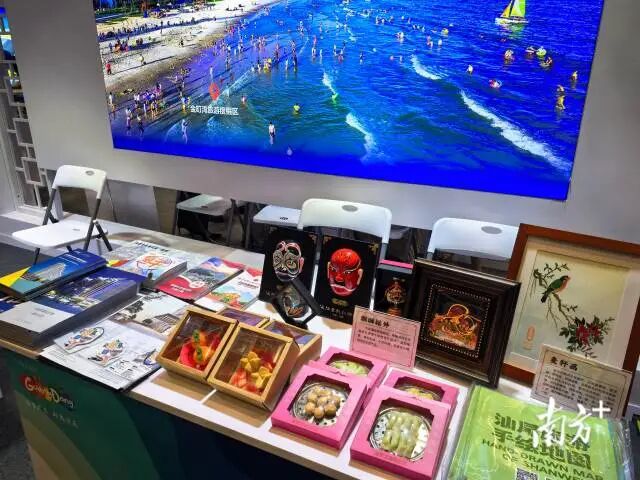 汕尾展区通过图文展板与产品实物陈列,全景式展现“红、蓝、绿、古、特”五大核心旅游资源,其中文创产品海陆丰戏剧脸谱、土叽咕、麦秆画、麒麟摆件、美食仿真软陶等琳琅满目,构建起可感知的汕尾非遗展示空间。