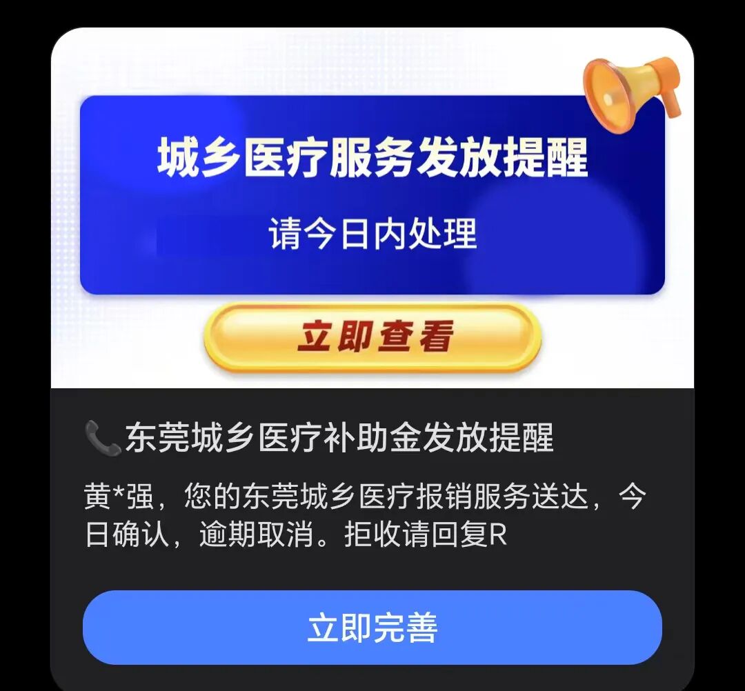 话术:“【健康之家】您的城乡医疗补贴已送达,今日确认,逾期取消,点击链接>>”