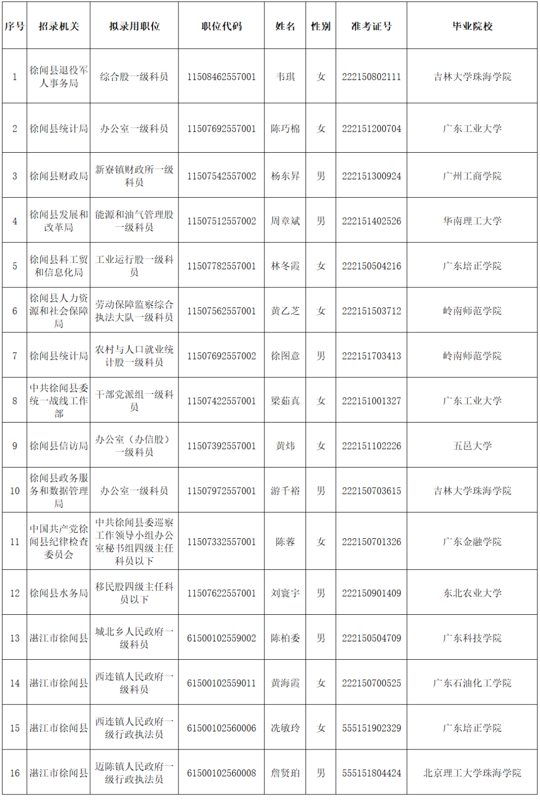 徐闻县2025年拟录用公务员名单(第一批)