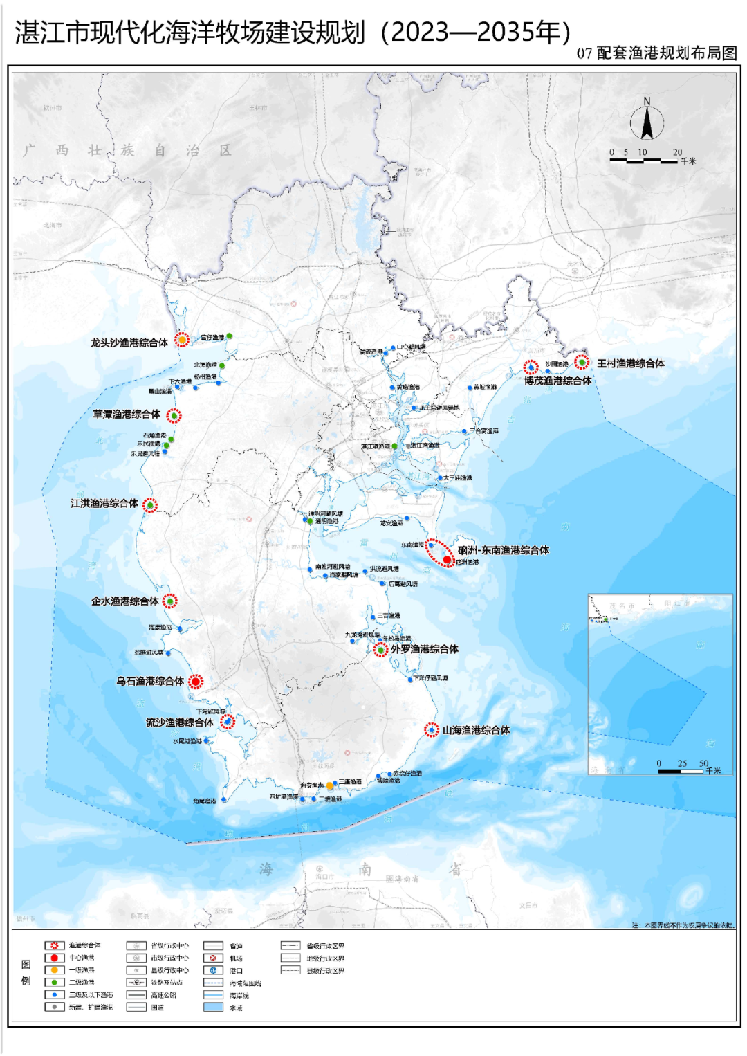 建设“粤海粮仓”主基地:在北部湾乐民海域、包金沙海域、企水海域、角尾湾、雷州湾、吉兆湾等海域规划布局19片近海生态养殖园区,总面积约229平方千米。近海生态养殖园区主要开展普通网箱、贝藻类筏式以及多营养层级综合立体养殖。在北部湾乐民海域、包金沙海域、企水海域、流沙湾、外罗海域、雷州湾、硇洲岛海域、吉兆湾等海域规划布局20片深远海装备养殖园区,面积约390平方千米。