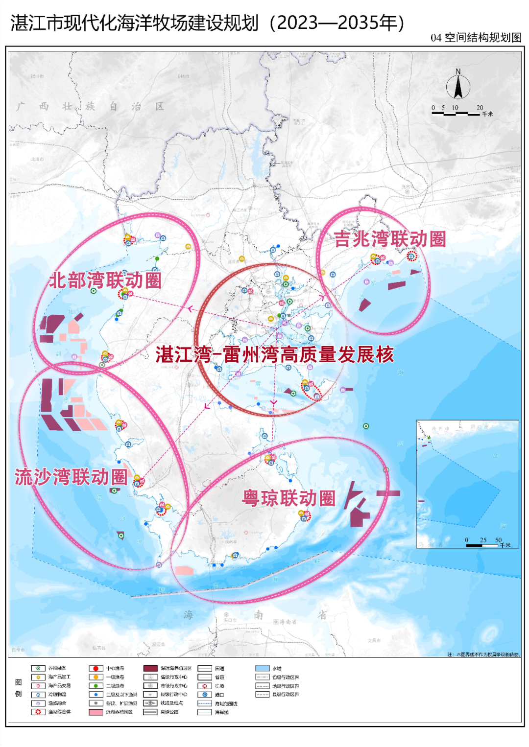 落实省级现代化海洋牧场“三带二十区”总体发展格局,优化现代化海洋牧场全产业链空间布局,推动陆基、渔港、近海和深远海等生产要素和空间资源优化配置,结合雷州半岛三面环海地形,构建湛江全链分工协调、空间组织高效的“一核四圈”陆海联动空间格局。
