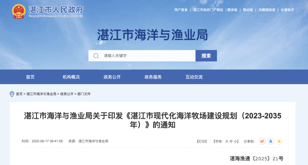 湛江市是海洋大市,全省海域最辽阔、海岸线最长、滩涂面积最广,光热资源丰富,海域生态环境良好,水生生物资源丰富,海水养殖产业居全省前列,具备建设现代化海洋牧场的得天独厚条件和坚实产业基础。