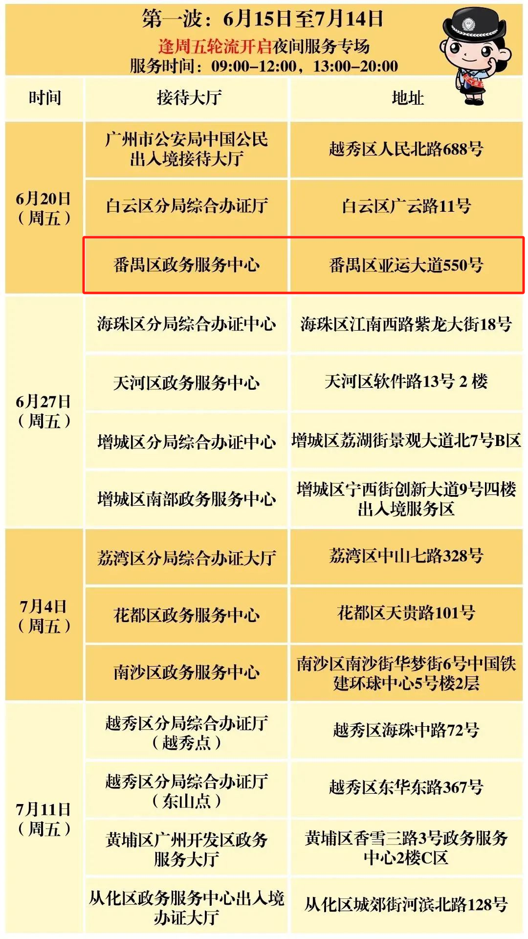 第一波:6月15日至7月14日,逢周五轮流开启夜间服务专场,服务时间:09:00-12:00,13:00-20:00;