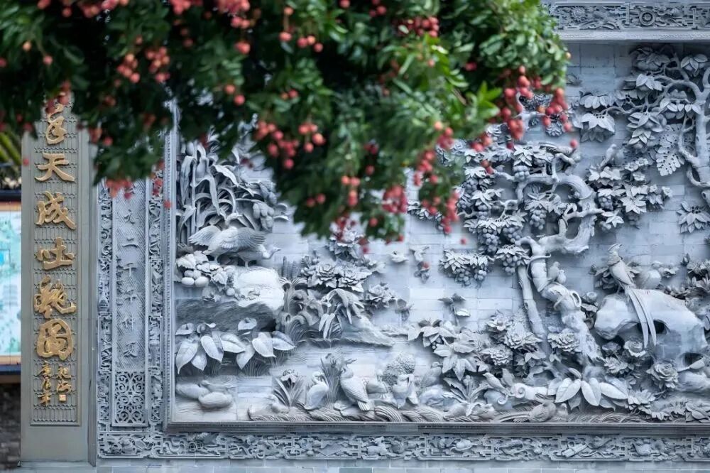 除宝墨园外,余荫山房的4棵荔枝树也迎来丰收盛景。园内广场上,2棵百年古荔尤为引人注目,枝头缀满红艳饱满的果实,远望如彤云蔽日,近观颗颗娇艳欲滴,引得游客纷纷驻足拍照,成为园内新晋打卡点。这些古荔不仅以果实诱人,更与园内随处可见的荔枝元素相映成趣,从原正门照壁的精美砖雕,到深柳堂满洲窗的荔枝纹饰,都承载着园主人对硕果累累、富贵吉祥的美好期许,为这座岭南名园在夏日更添一份独特的文化韵味。