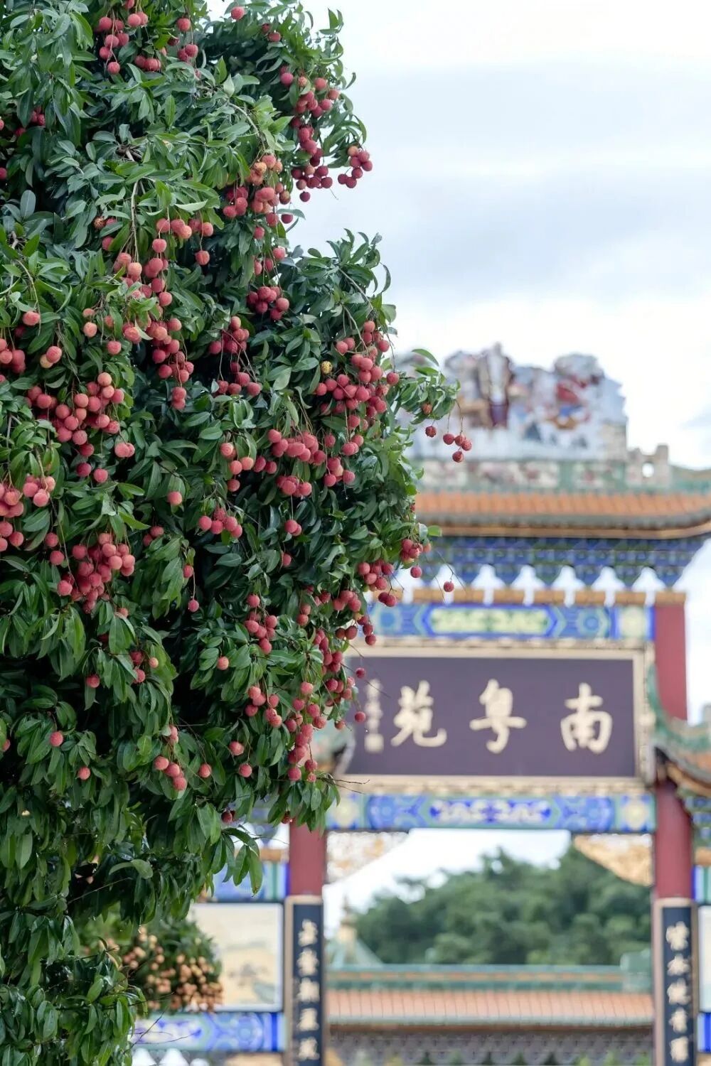 夏风轻拂,番禺宝墨园内的百年红荔迎来了一年中最绚烂的时节。亭台楼阁间,一串串饱满的桂味、怀枝和妃子笑荔枝从翠绿的枝叶间垂挂而下,宛如红宝石点缀在飞檐斗拱之间,构成了一幅生动独有的“古典园林赏荔图景”。仅300米之隔的南粤苑内,荔枝树同样硕果累累,红艳的果实与青砖黛瓦、小桥流水相映成趣,成为游客最爱的拍照打卡地。