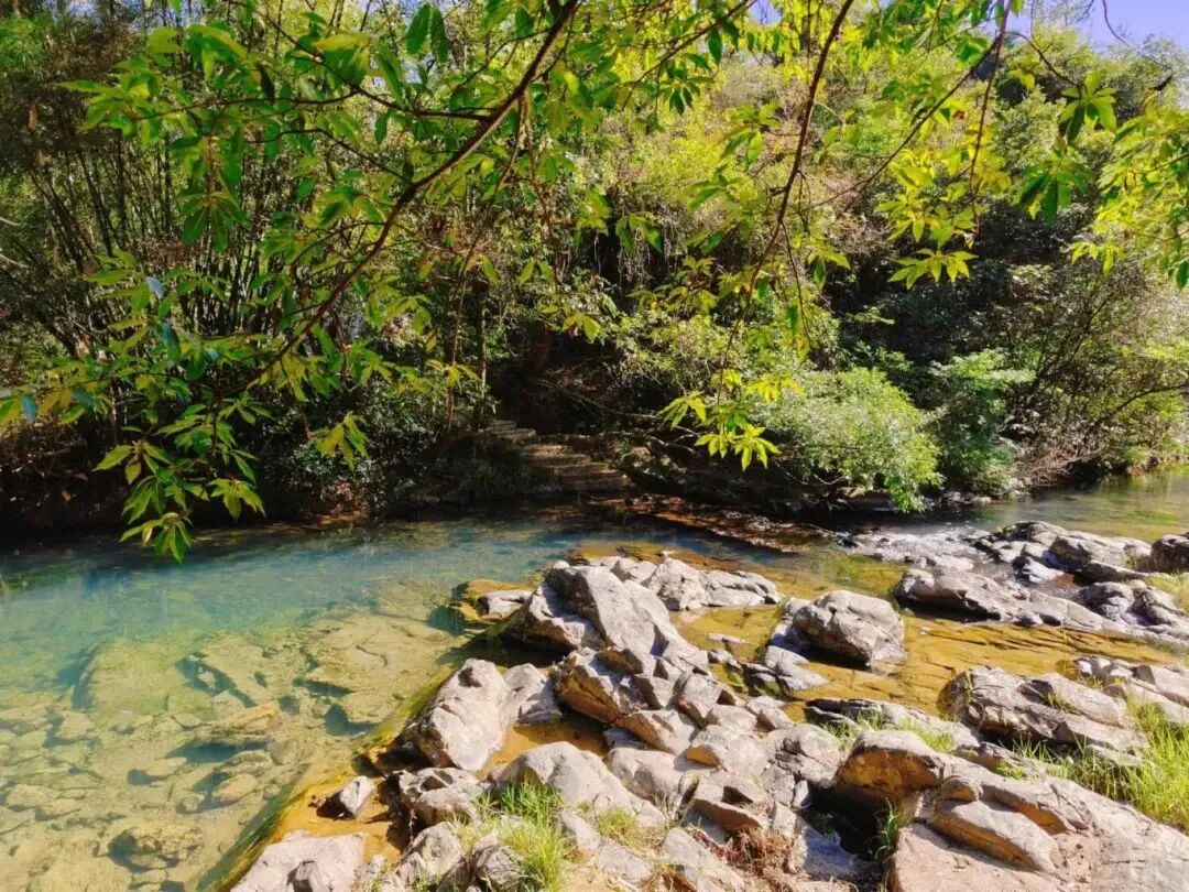 行走在山间,清新的空气扑鼻而来,每一口呼吸都仿佛是对肺腑的一次洗礼。沿途可见清澈见底的溪流潺潺流淌,水底的鹅卵石清晰可见,溪水在阳光的照耀下闪烁着粼粼波光。溪边的树木倒映在水中,与蓝天白云相互映衬,构成了一幅幅绝美的山水画卷。在山林深处,还藏着一处落差近 10 米的瀑布,宛如水帘悬挂,在夏季雨水充沛时,瀑布气势磅礴,水花飞溅,发出震耳欲聋的轰鸣声,让人心生敬畏。