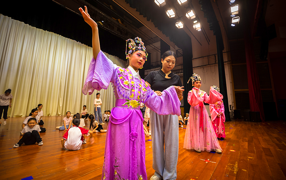 课堂里没有枯燥的教条,孩子们既能跟着老师学甩水袖、吊嗓子,还能化身“小主播”用粤语讲解粤剧行头。从念白到台步,从化妆到登台,孩子们在沉浸式体验中,正把粤剧变成属于自己的文化新潮流。“让孩子们爱上粤剧,秘诀就藏在‘拆盲盒’的惊喜里,我们不会一上来就教‘手眼身法步’,而是把粤剧拆成‘文化游戏包’,比如传统粤剧的‘喜怒哀乐’,小朋友很难理解,我们就用‘表情包’教学法——把‘喜怒哀乐’对应成‘笑’‘哭’‘裂开’等网络表情,让他们先模仿再提炼,现在孩子们自创的‘戏精表情包’,连老艺人看了都竖大拇指。”罗定市粤剧团粤剧老师彭静介绍。