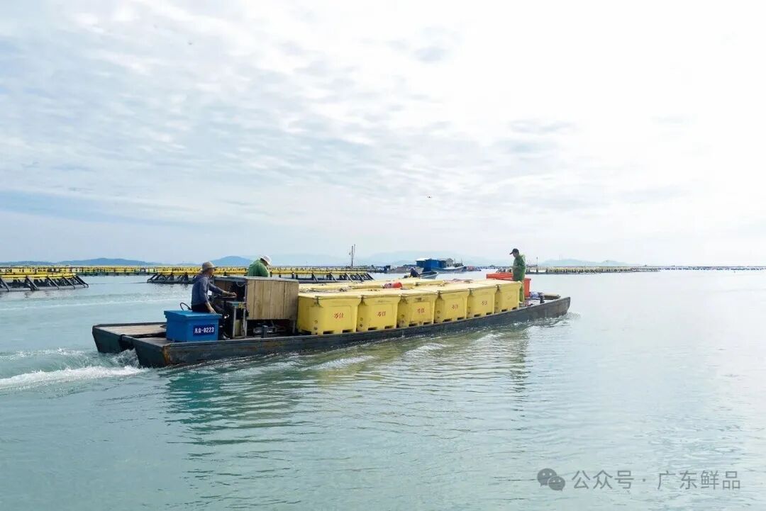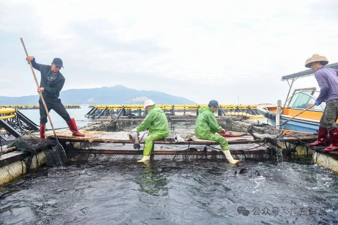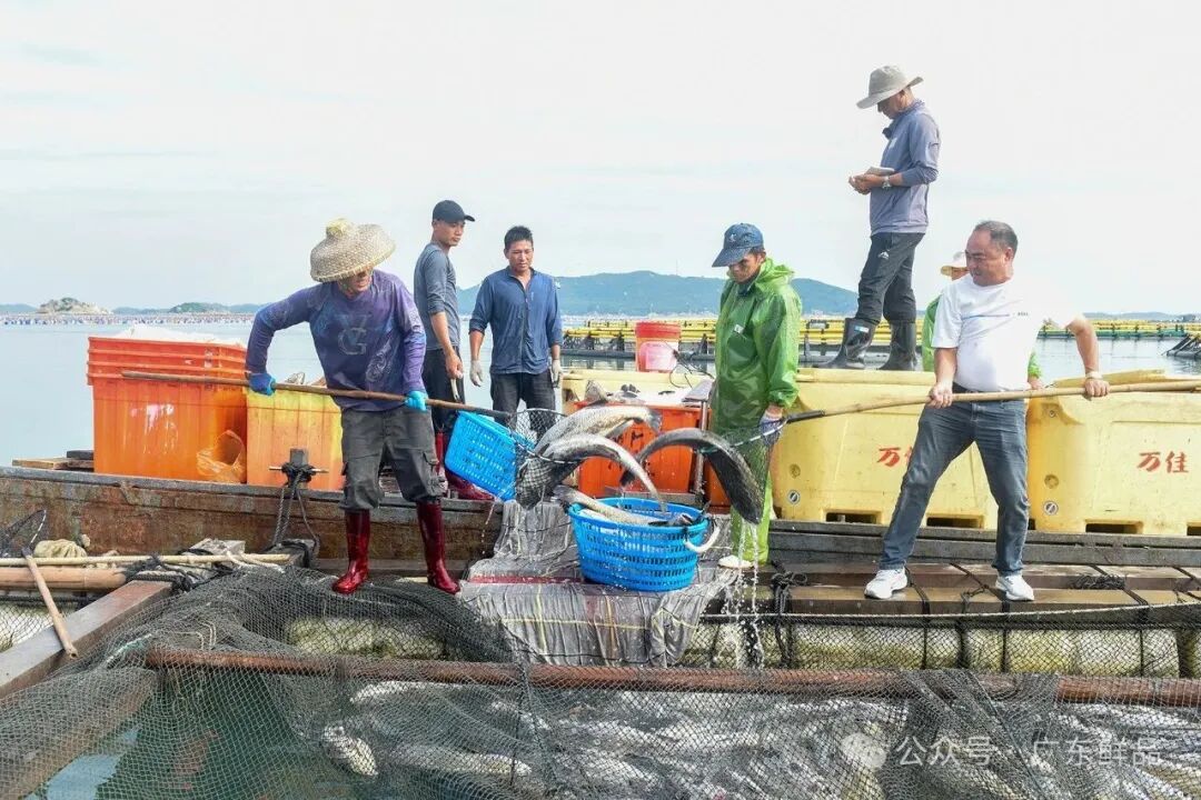 清晨5时许,饶平县柘林湾海域,潮州市荣汛农业有限公司现代化海洋牧场基地,工人已经忙开了,他们分工合作,有条不紊,先将鱼赶到重力式网箱一角,然后引到移动式工作平台。