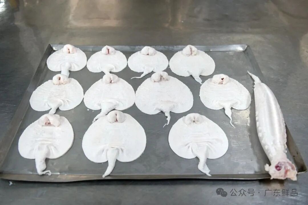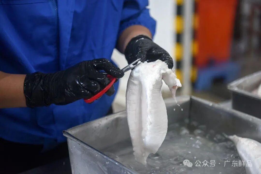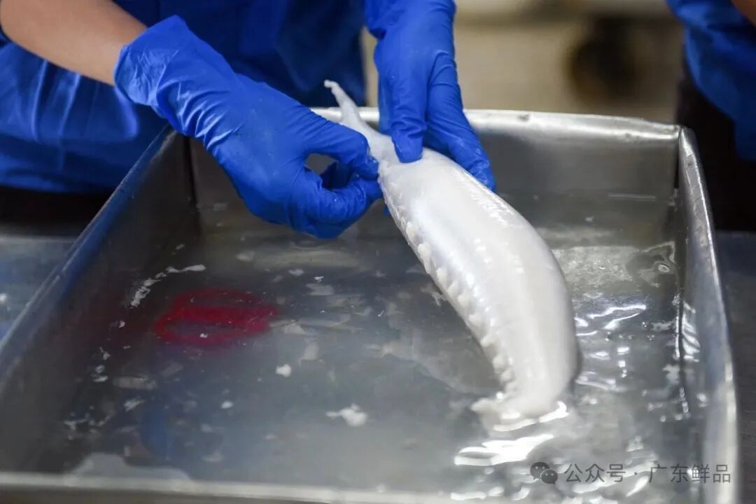 工作人员动作娴熟开膛取鱼鳔。