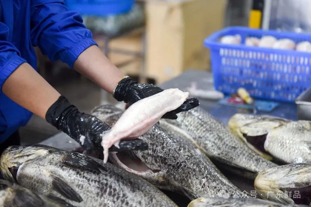工人将十几斤重的鮸鱼打捞起来,交给下一步骤放血处理。