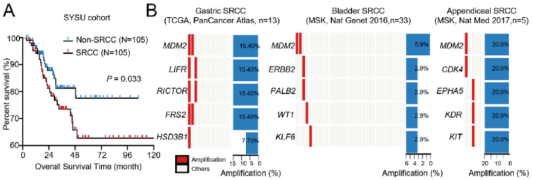 图1 MDM2 的拷贝数增加是 SRCC 的一个关键特征,较高的 MDM2 表达与不良预后相关