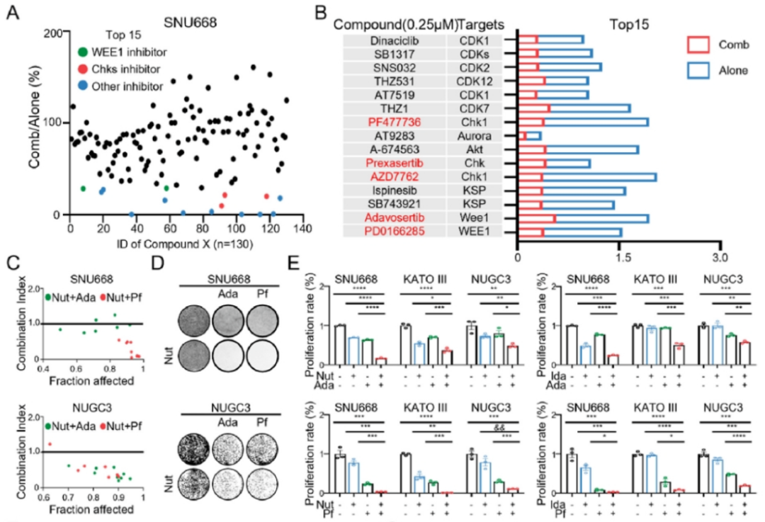 研究团队通过整合分析公共数据库及患者样本数据,发现MDM2在SRCC中高扩增,并具有治疗潜力(图1)。同时,通过高通量药物筛选,发现G2/M检查点抑制剂可以增敏MDM2抑制剂(图2)。