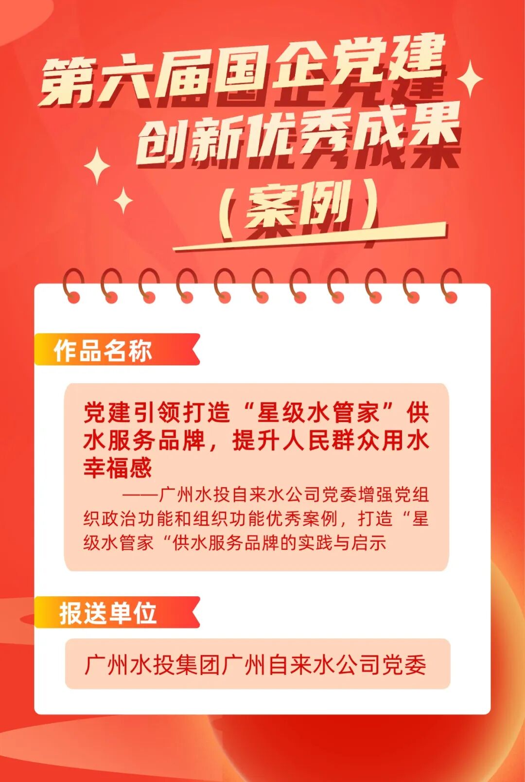近日,第六届国企党建创新优秀成果(案例)征集推选活动圆满落下帷幕,广州水投自来水公司党委报送的党建创新案例《党建引领打造“星级水管家”供水服务品牌》从1500余篇申报材料中脱颖而出,成功入选第六届国企党建创新优秀成果(案例)。这一实践以党建为红色引擎,将供水服务从“最后一公里”延伸至“最后一米”,为超大城市供水服务精细化升级提供“广州方案”。