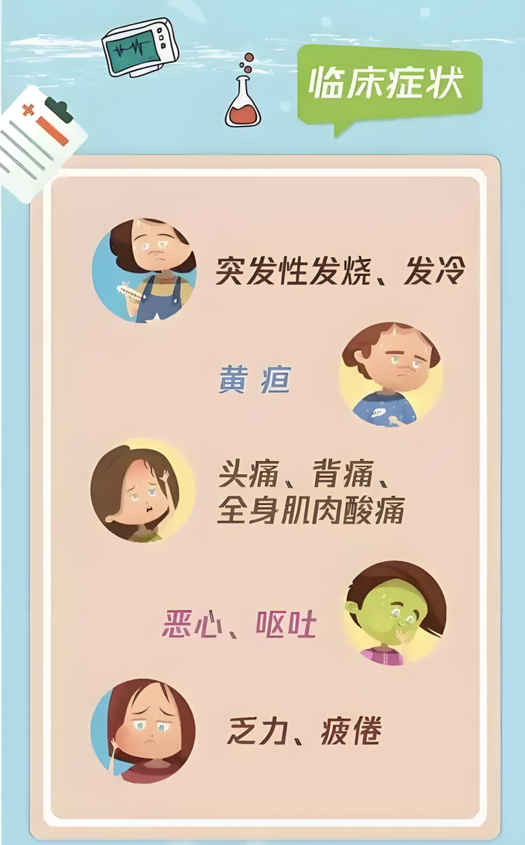 临床主要表现:急性起病,寒战、发热(可达39℃至41℃),头痛、肌痛,厌食、恶心、呕吐,全身不适等症状,重症患者可出现黄疸和肝脏、肾脏、血液系统等多器官功能损伤。