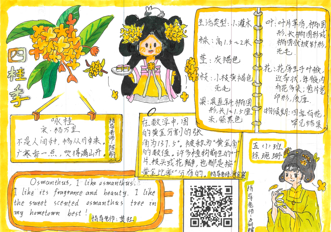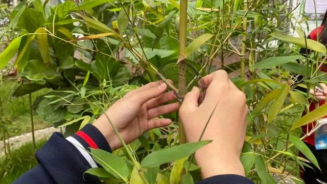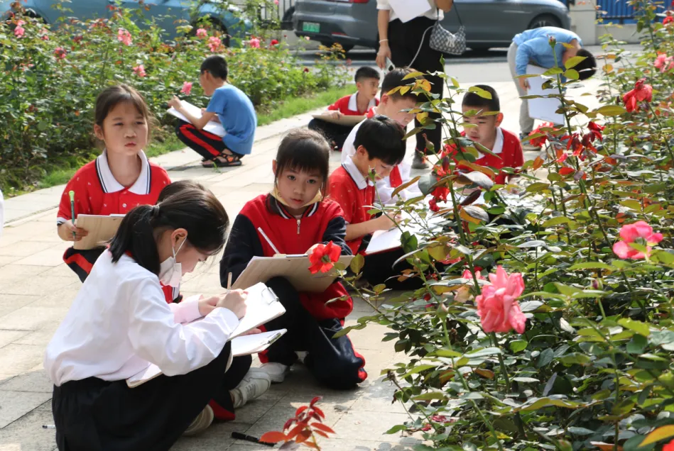数学课上,学生们在老师的引导下,使用量角器观察校园里植物根茎的生长角度,在学习数学几何知识的同时,还能了解到植物生长的规律;语文课上,学生们通过看、听、摸、闻等方式近距离观察校园里的植物,从而写下更生动的句子和文章。