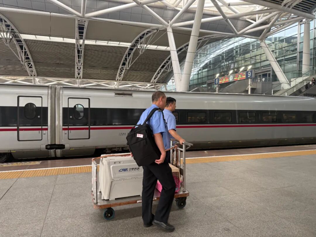 在这段全程2小时13分的旅途中,“KK”将由专职押运人员全程照料。押运人员通过高铁宠物专用箱监测系统观察宠物状态,定时巡视检查,视情况给宠物添加饮用水。