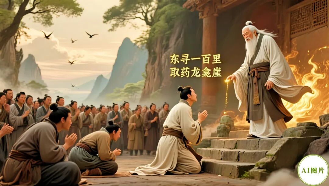 一天,村里来了一位长须白发的老者,专治各种疑难杂症。丽芝听后跪求老者、请其为家母看病。老者看完病后沉默不语,写下了一句“东寻一百里、取药龙龛崖”,尔后便不见踪迹。村民听闻后纷纷走出家门,向东叩拜老神仙。
