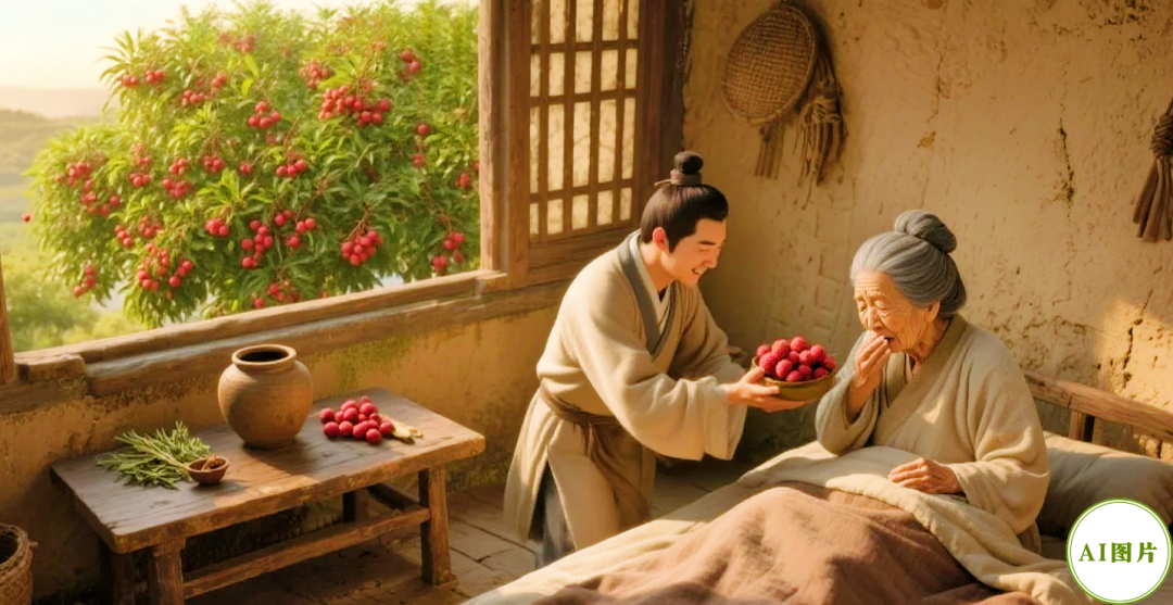 丽芝感应神灵恩赐,迅速捧起水果跑回家。母亲吃了水果后,病情慢慢好转。丽芝又把水果核种满了房前屋后,以供家母入药所用。