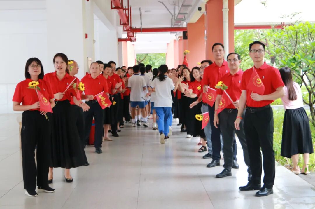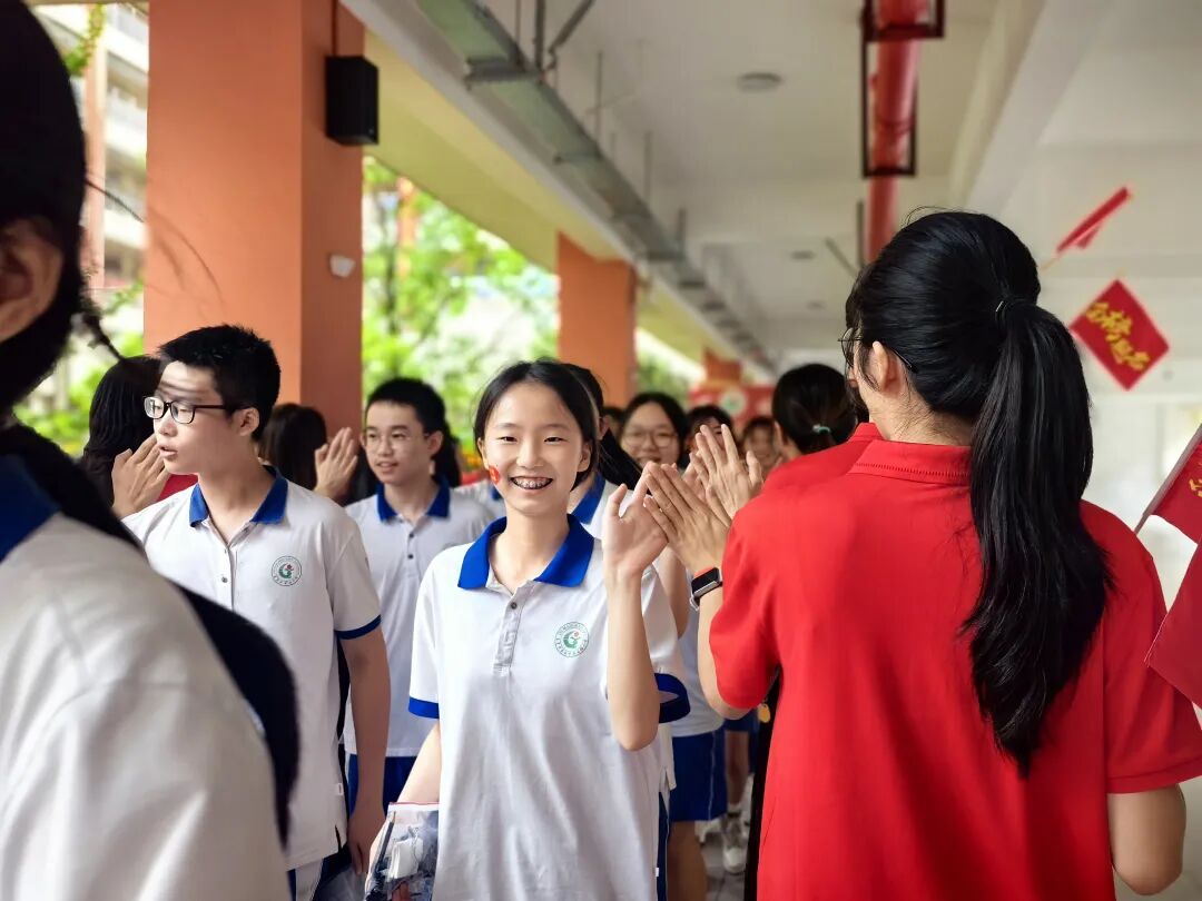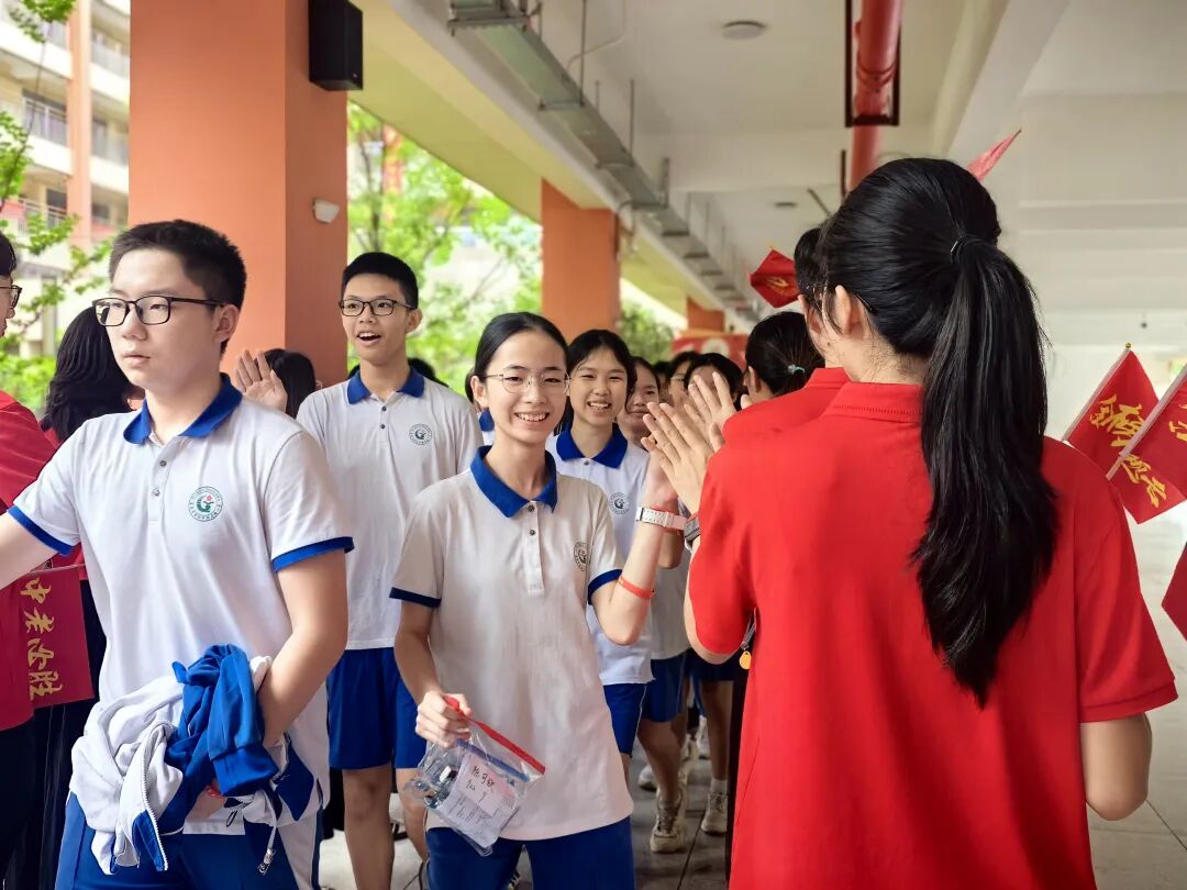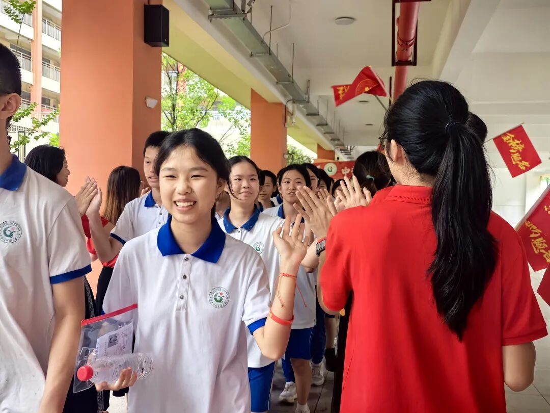 送考现场,老师们身穿统一红色送考服,与奔赴考场的考生击掌。“中考加油!”“沉着应考!”他们用温暖的笑容和响亮的加油声,为考生们壮行助威。