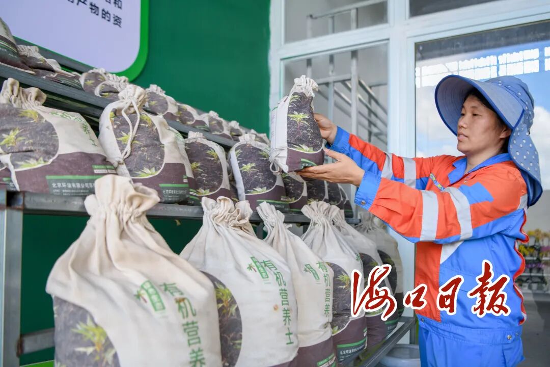 5月23日,在琼山区红旗镇全国秸秆综合利用展示基地内,工作人员正向记者展示由农林废弃物制作成的绿色有机营养土。海口市融媒体中心记者 苏弼坤 摄