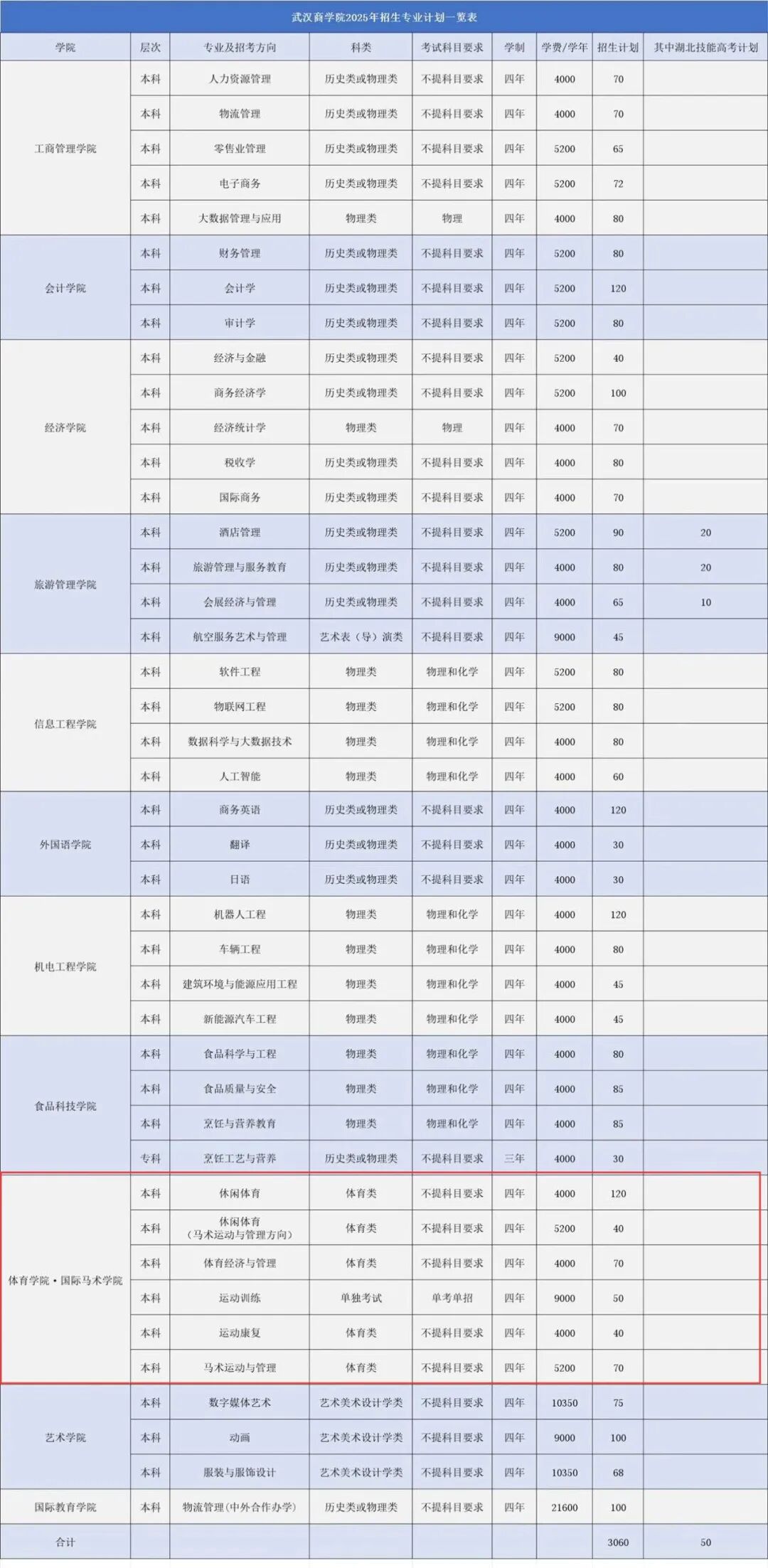 作为国内唯一开设这一本科专业的武汉商学院。2025年,武汉商学院在全国19个省、自治区、直辖市招生,总计划3060人,其中本科3030人,专科30人。其中体育学院·国际马术学院计划招生390人。