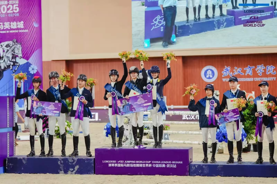 2025国际马联场地障碍世界杯中国联赛武汉站,武汉商学院三队获得了1.20M级别团体赛亚军。图片来自中马协