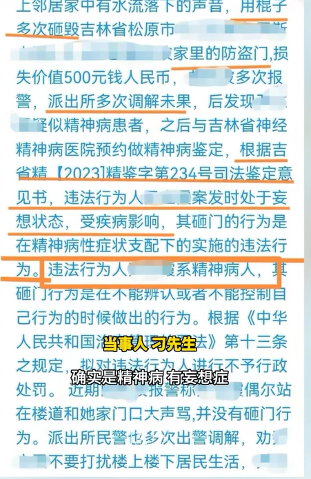 近日,吉林省松原市的刁先生告诉记者,自2022年12月以来,自己一家长期受到楼下精神病邻居上门砸门咒骂,生活严重受到影响,除了做饭几乎都只能待在阁楼生活。