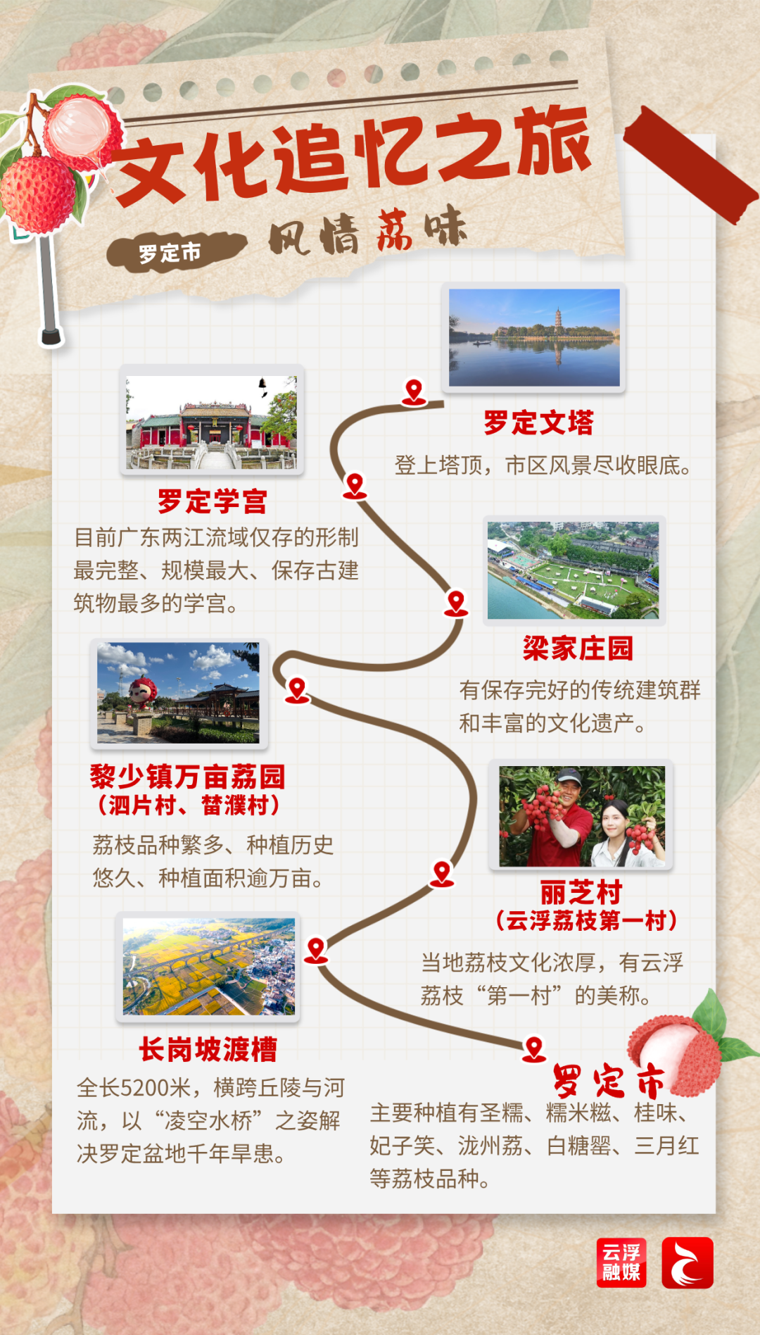 路线:罗定文塔→罗定学宫→梁家庄园→黎少镇万亩荔园(泗片村、榃濮村)→丽芝村(云浮荔枝第一村)→长岗坡渡槽