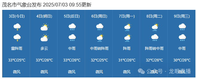 今天白天,多云,有分散雷阵雨, 风向:偏东风,风力2到3级,最低温度25℃ ,最高温度33℃ ,相对湿度60%-90%;4日,多云,气温26℃~33℃;5日~9日,有明显降雨,气温起伏不大。