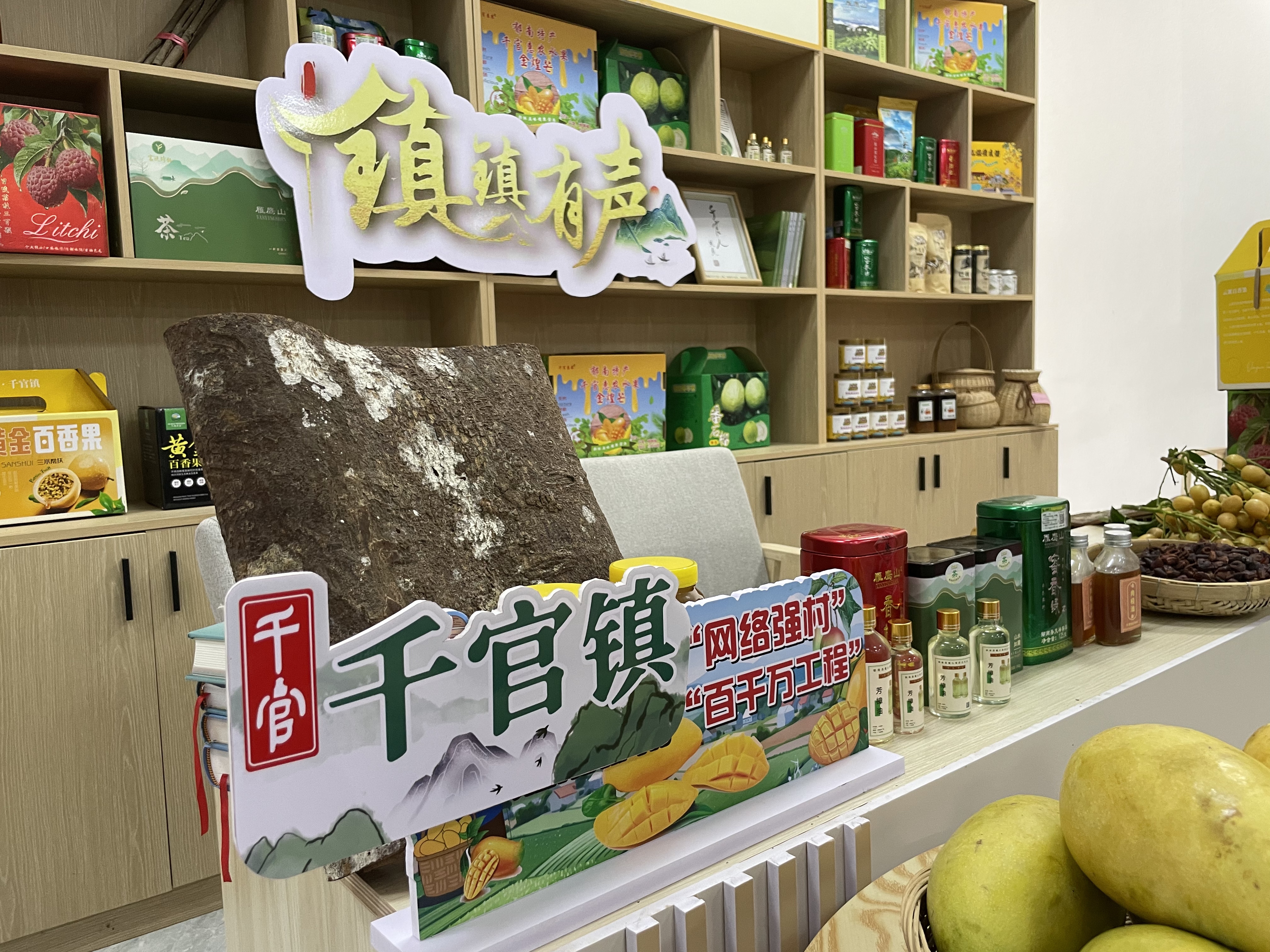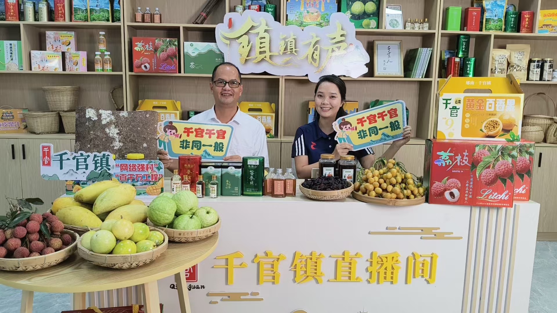 首先登场的是果实呈心形的红灯笼荔枝。这个由“糯米糍”与“怀枝”嫁接而成的本地新品种,以肉质细嫩、多汁、口感清脆、甜而不腻的特点获得一致认可。随后亮相的金煌芒、番石榴、黄金百香果、无核黄皮及各种水果沙拉、饮品等,令人垂涎;桂皮、芳香樟油、丁香榄角、广地龙、雁鹰山茶等千官好物介绍,引发广泛关注。80后“新农人”余冰分享的返乡创业故事,以及本地网红大勇通过系列助农直播为乡村发展注入新活力的事迹,既展现了新时代农民的精神风貌,也彰显了千官镇产业发展的无限潜力。